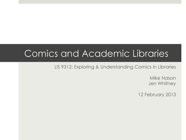 academic libraries ¤ Three major trends influencing development of popular reading collections at academic libraries: ¤ User-centred libraries ¤ Emphasis on “library as place” ¤ Promotion of reading skills ¤ Popular reading collections should reflect current student interests, including graphic novels & comics