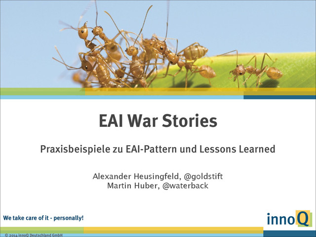 Deutschland GmbH EAI War Stories Praxisbeispiele zu EAI-Pattern und Lessons Learned ! Alexander Heusingfeld, @goldstift Martin Huber, @waterback