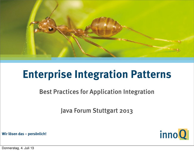 (Gamma et al), 1994 Proven solutions for common problems Enterprise Integration Patterns (Hohpe & Woolf), 2003 Swiss-army knife for asynchronous messaging Donnerstag, 4. Juli 13