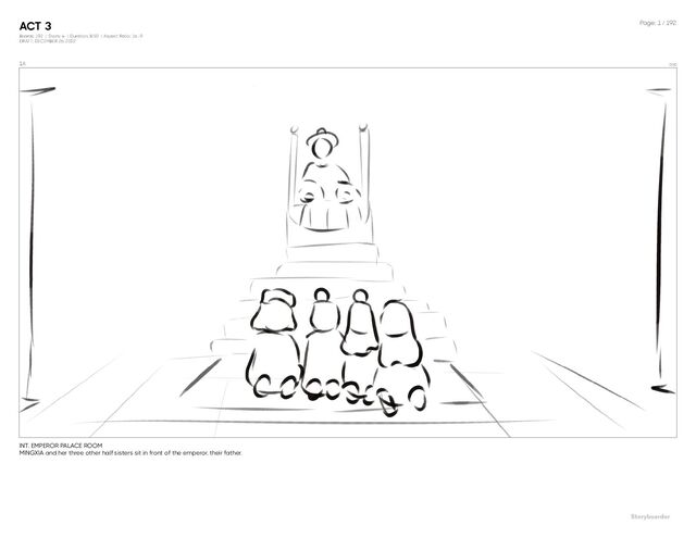 | Aspect Ratio: 16 : 9 DRAFT: DECEMBER 26, 2022 Page: 1 / 192 1A 0:00 INT. EMPEROR PALACE ROOM MINGXIA and her three other half sisters sit in front of the emperor, their father.