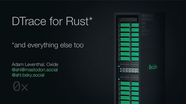 crate $ cargo add usdt • Written by me and my Oxide colleague, Ben Naecker • At Oxide we use this everywhere! • Where to add probes? ◦ Where you log ◦ Points of interest ◦ Before and after actions whose latency you might want to measure ◦ …