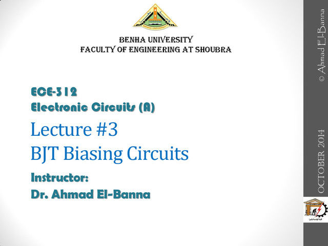 Lecture #3 BJT Biasing Circuits Instructor: Dr. Ahmad El-Banna Benha
