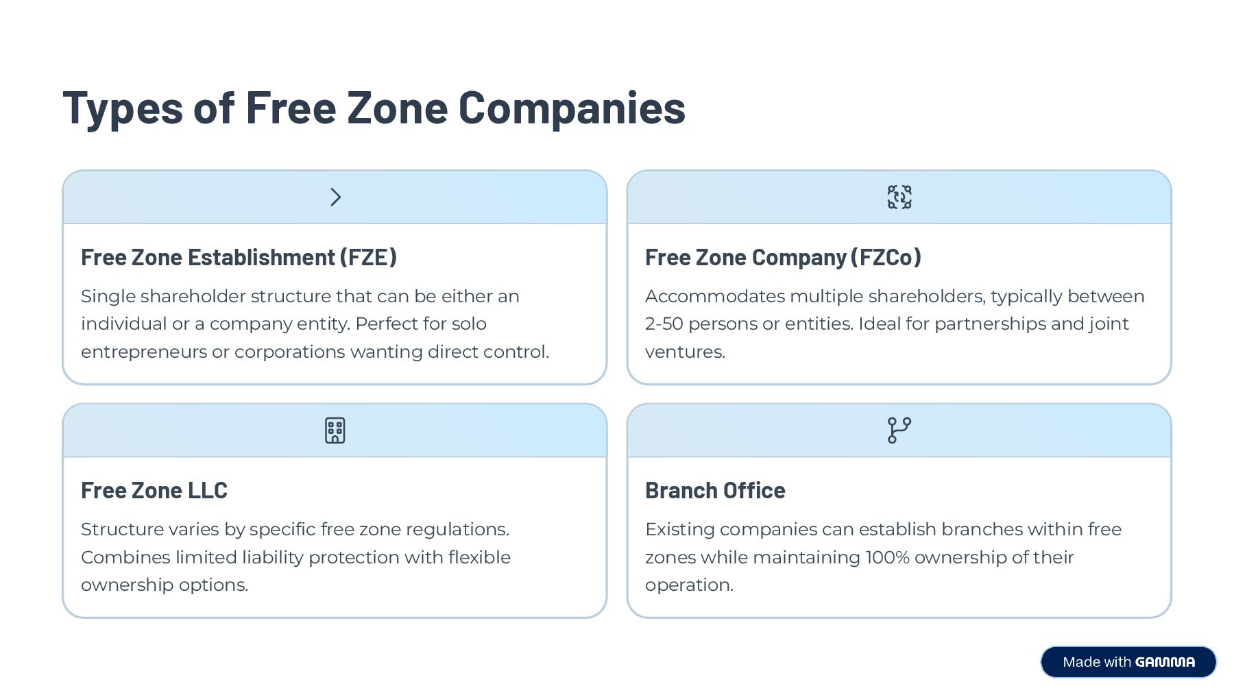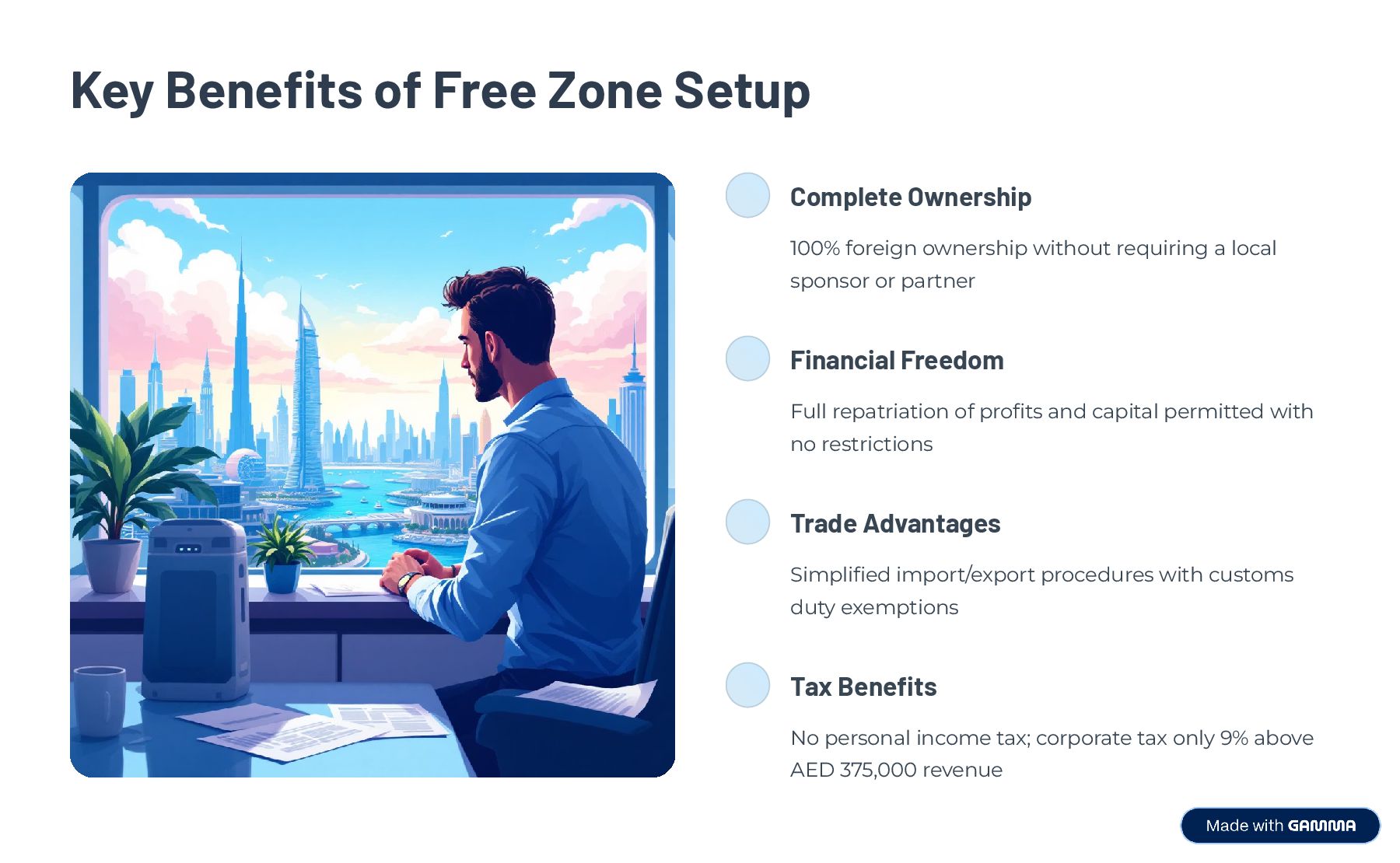 With access to major seaports, airports, and highways, freezone company formation in the UAE connects you to over 3 billion consumers across the Middle East, Africa, and Asia. Choose from legal structures like FZE, FZCo, or branch office, and operate with zero customs duties and limited liability. It’s the ideal gateway for international companies, exporters, and service-based firms seeking fast entry into the UAE market.