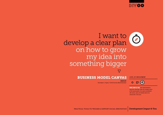 grow my idea into something bigger } Business Model Canvas 04 Development Impact & You PRACTICAL TOOLS TO TRIGGER & SUPPORT SOCIAL INNOVATION CREATED by Osterwalder A., Pigneur Y (2010) Business Model Generation level of involvement more complex tool that should ideally be done over a few days. Given the strategic nature of the inputs/outputs, this needs consultations with seniors, peers and ideally needs to be revised after a first pass.