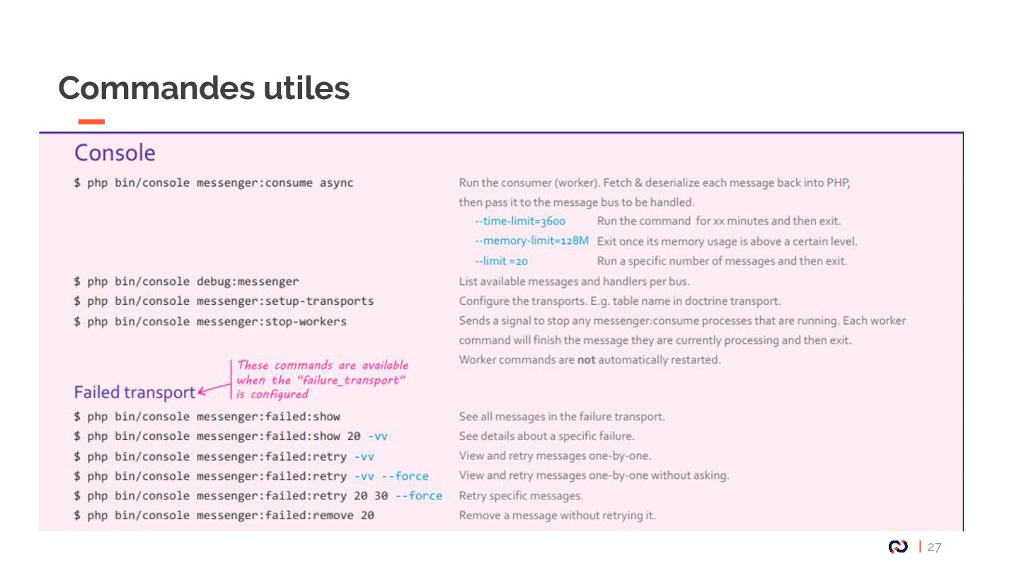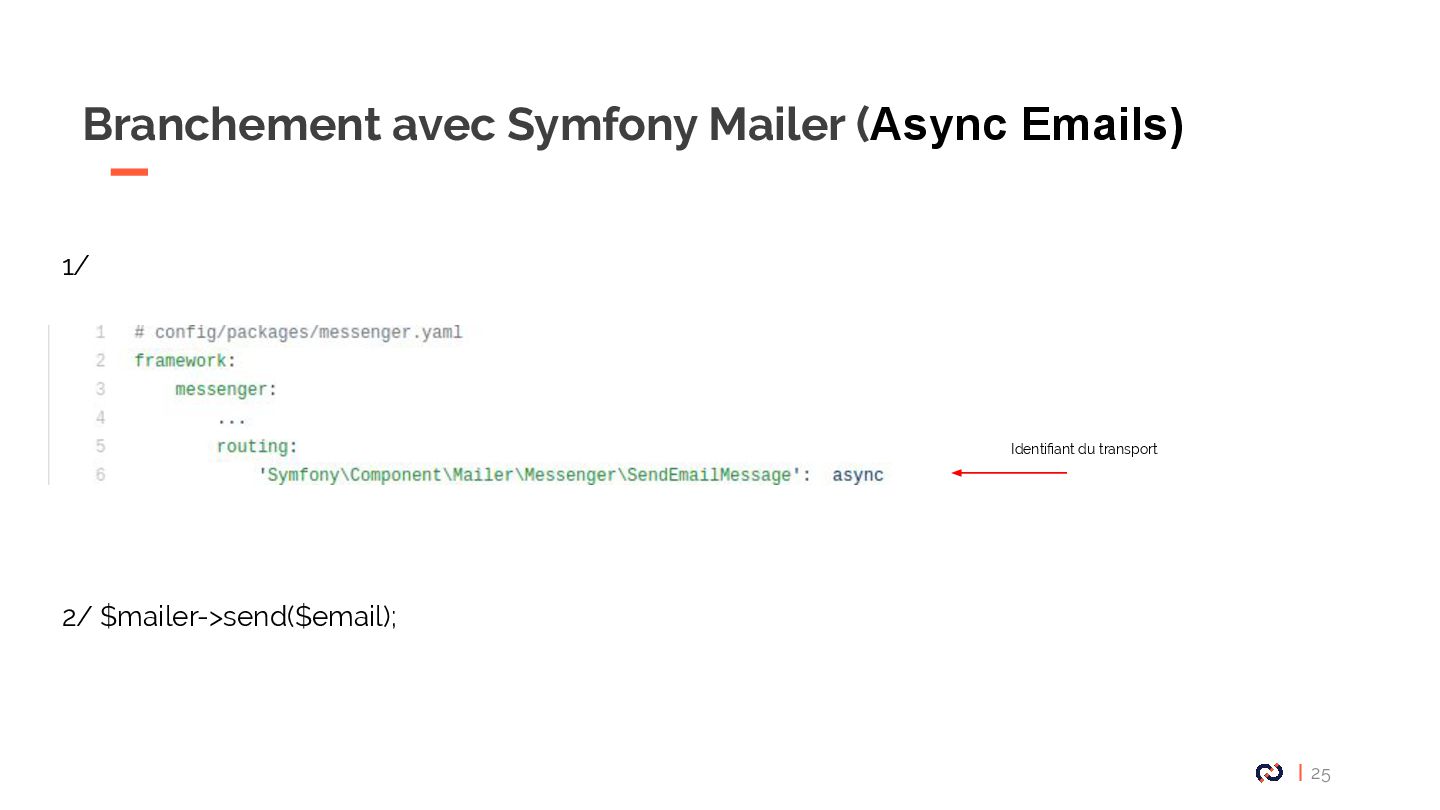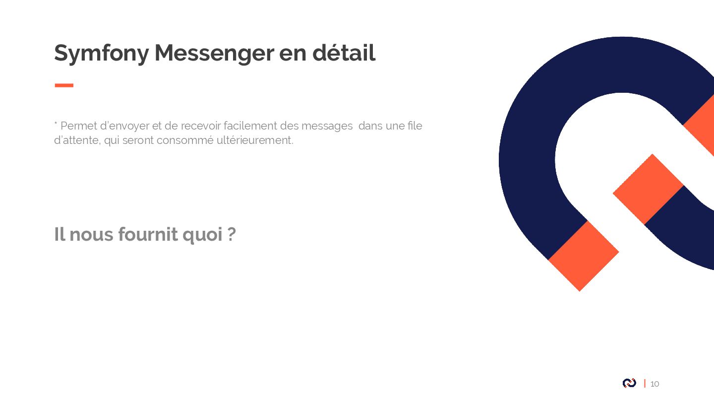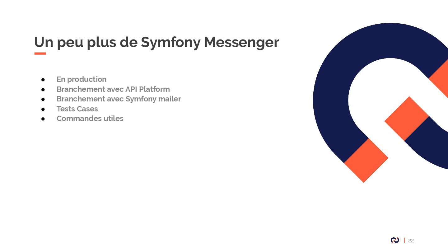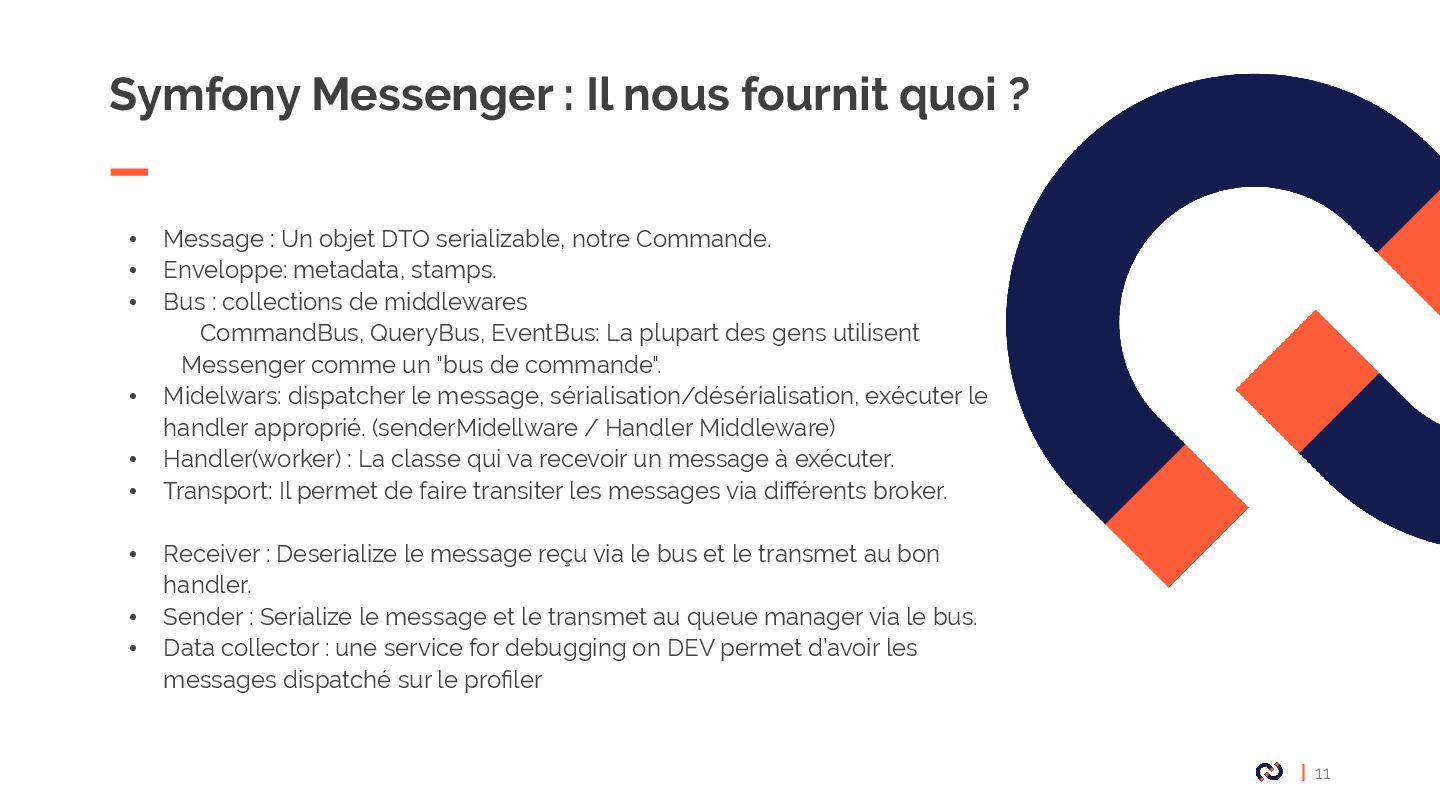 • Message : Un objet DTO serializable, notre Commande. • Enveloppe: metadata, stamps. • Bus : collections de middlewares CommandBus, QueryBus, EventBus: La plupart des gens utilisent Messenger comme un "bus de commande". • Midelwars: dispatcher le message, sérialisation/désérialisation, exécuter le handler approprié. (senderMidellware / Handler Middleware) • Handler(worker) : La classe qui va recevoir un message à exécuter. • Transport: Il permet de faire transiter les messages via différents broker. • Receiver : Deserialize le message reçu via le bus et le transmet au bon handler. • Sender : Serialize le message et le transmet au queue manager via le bus. • Data collector : une service for debugging on DEV permet d’avoir les messages dispatché sur le profiler