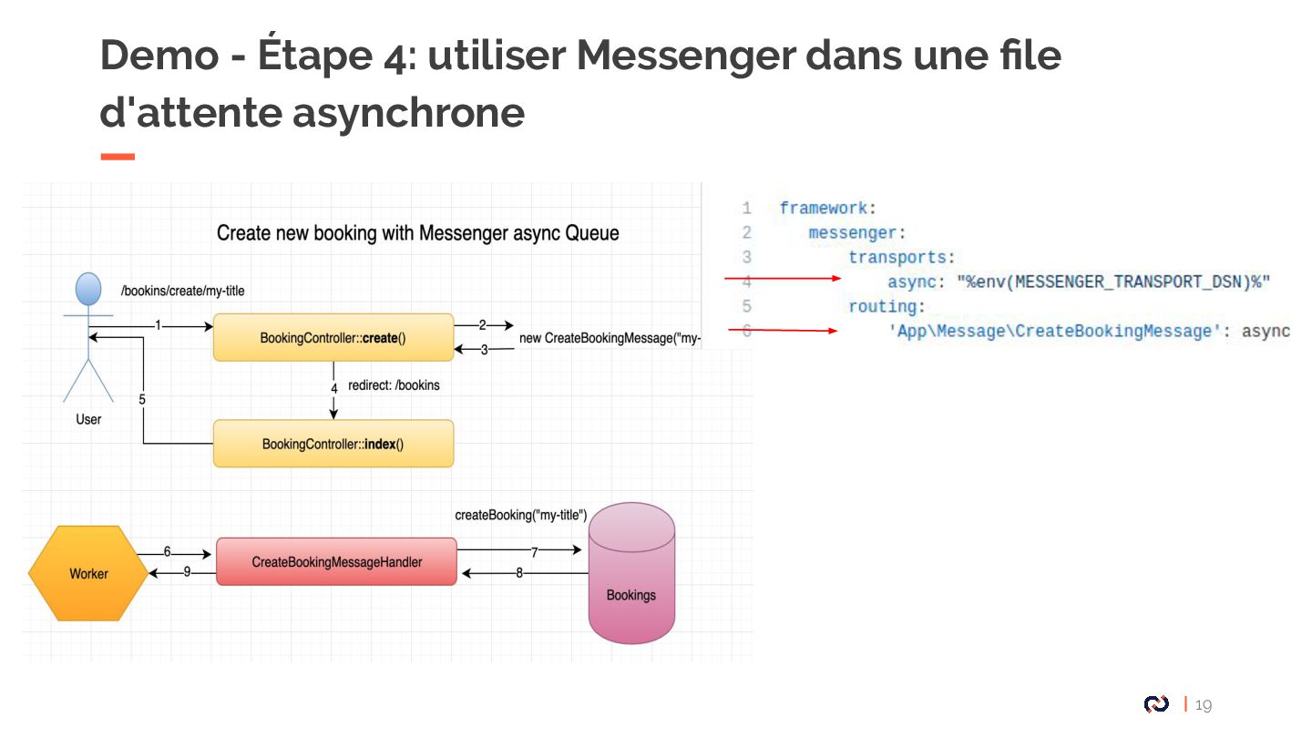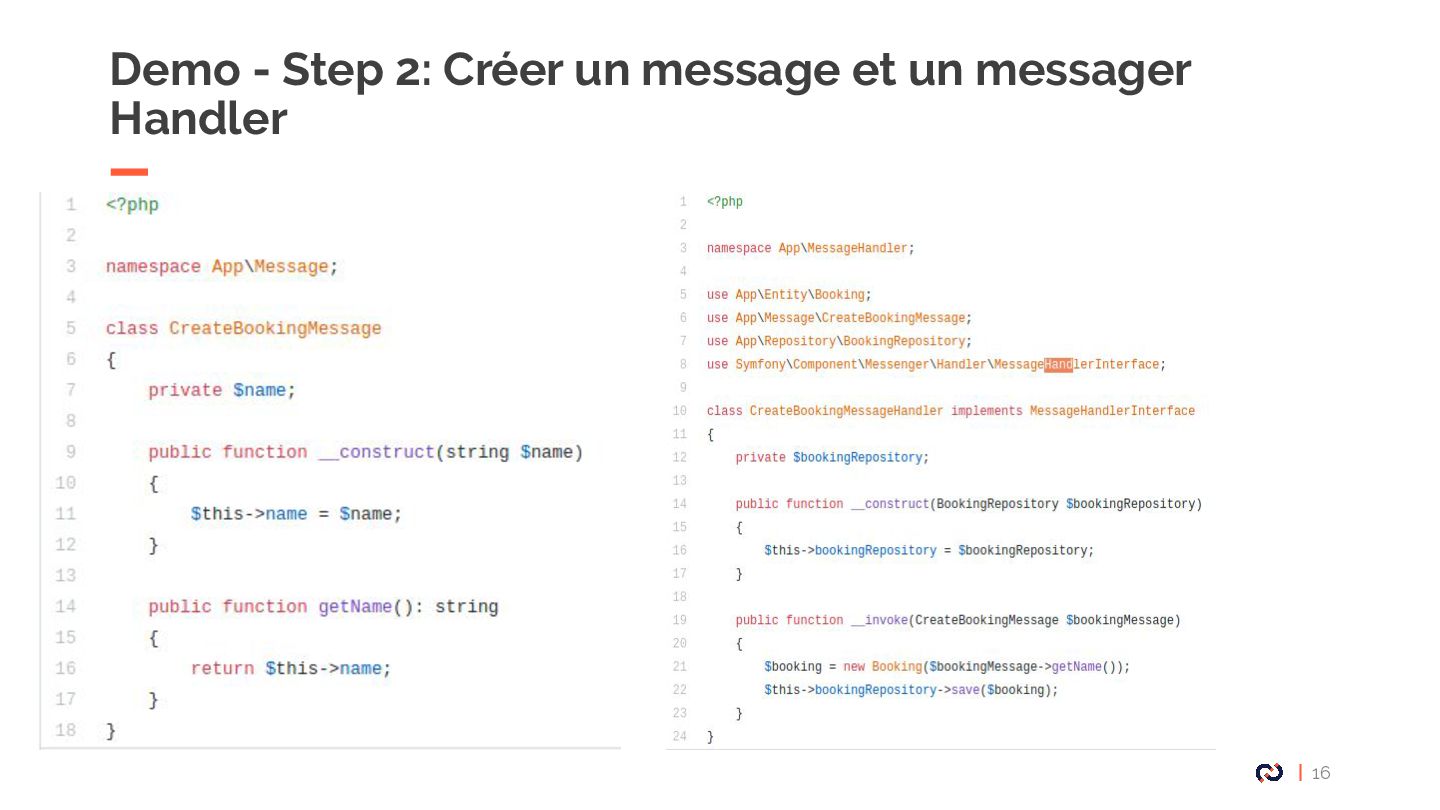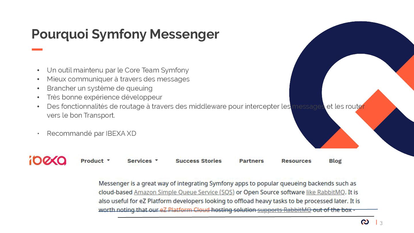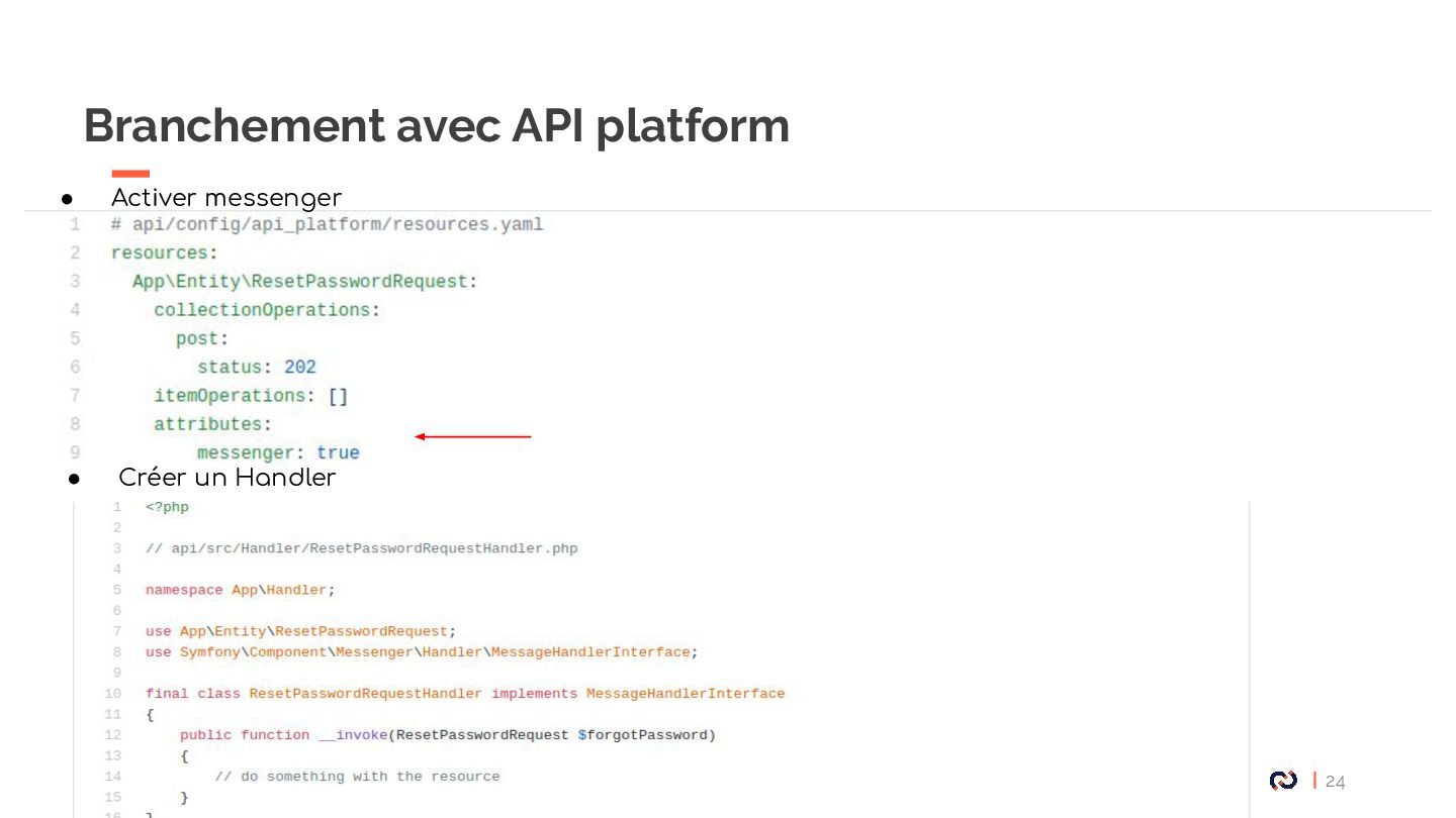 • Message : Un objet DTO serializable, notre Commande. • Enveloppe: metadata, stamps. • Bus : collections de middlewares CommandBus, QueryBus, EventBus: La plupart des gens utilisent Messenger comme un "bus de commande". • Midelwars: dispatcher le message, sérialisation/désérialisation, exécuter le handler approprié. (senderMidellware / Handler Middleware) • Handler(worker) : La classe qui va recevoir un message à exécuter. • Transport: Il permet de faire transiter les messages via différents broker. • Receiver : Deserialize le message reçu via le bus et le transmet au bon handler. • Sender : Serialize le message et le transmet au queue manager via le bus. • Data collector : une service for debugging on DEV permet d’avoir les messages dispatché sur le profiler