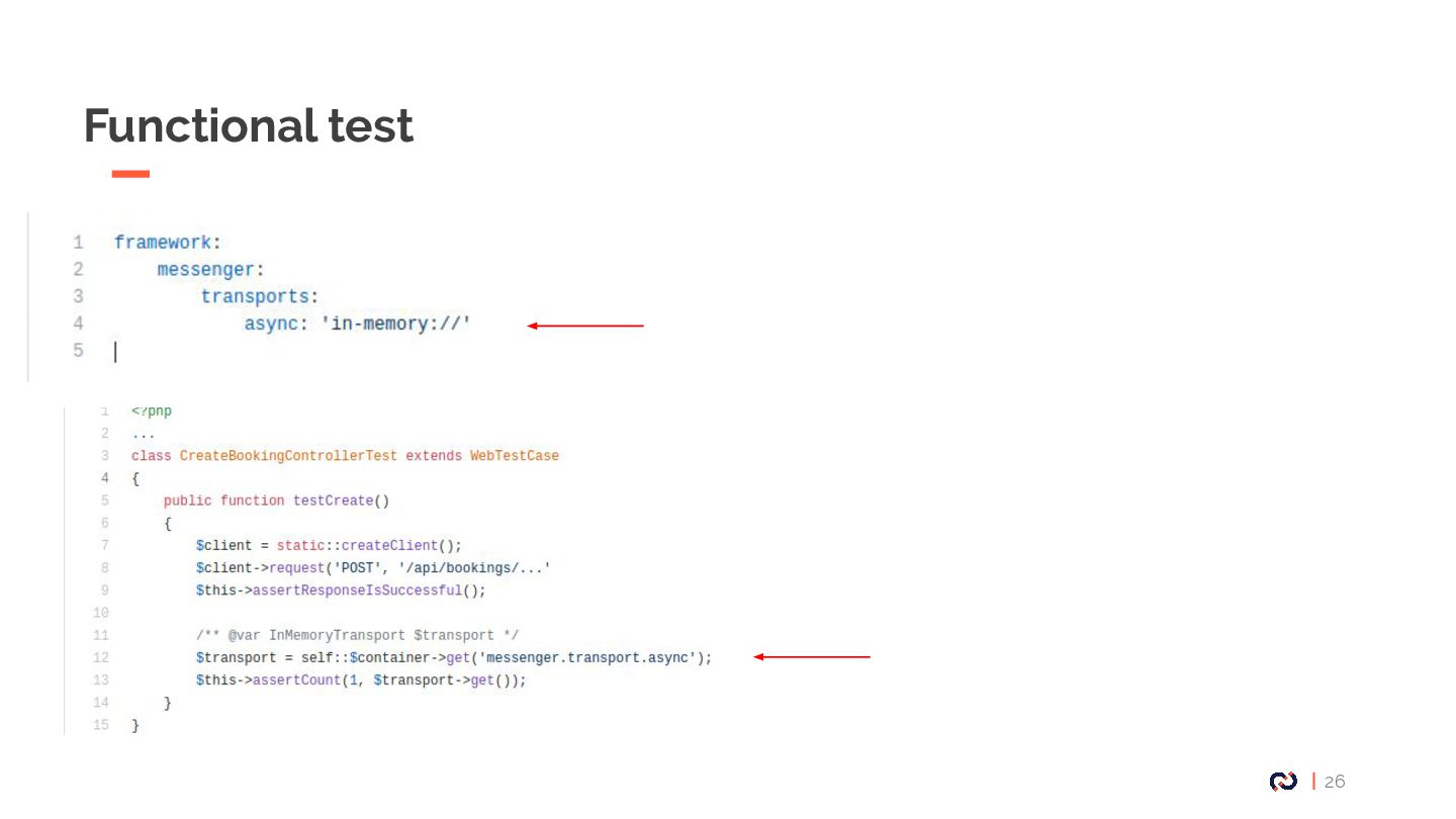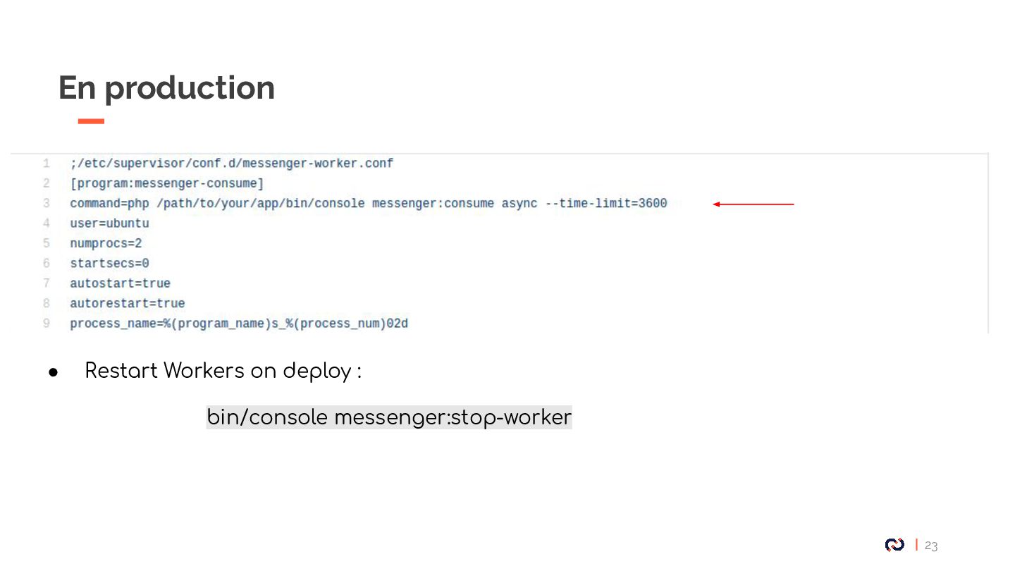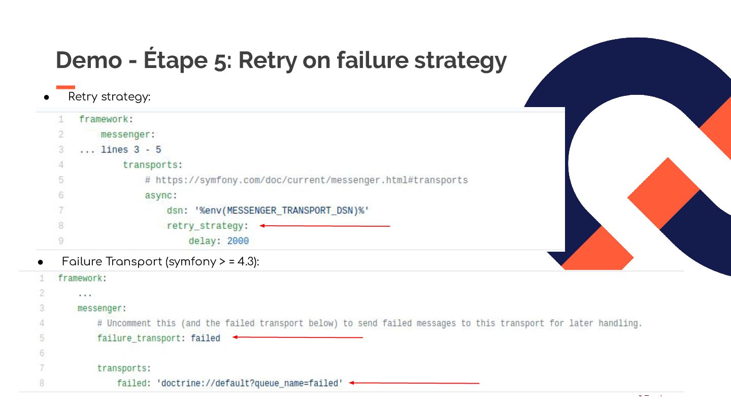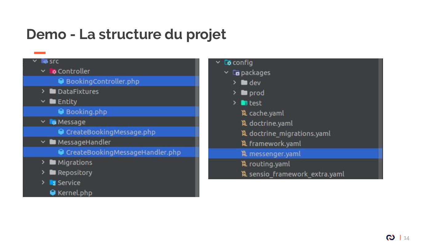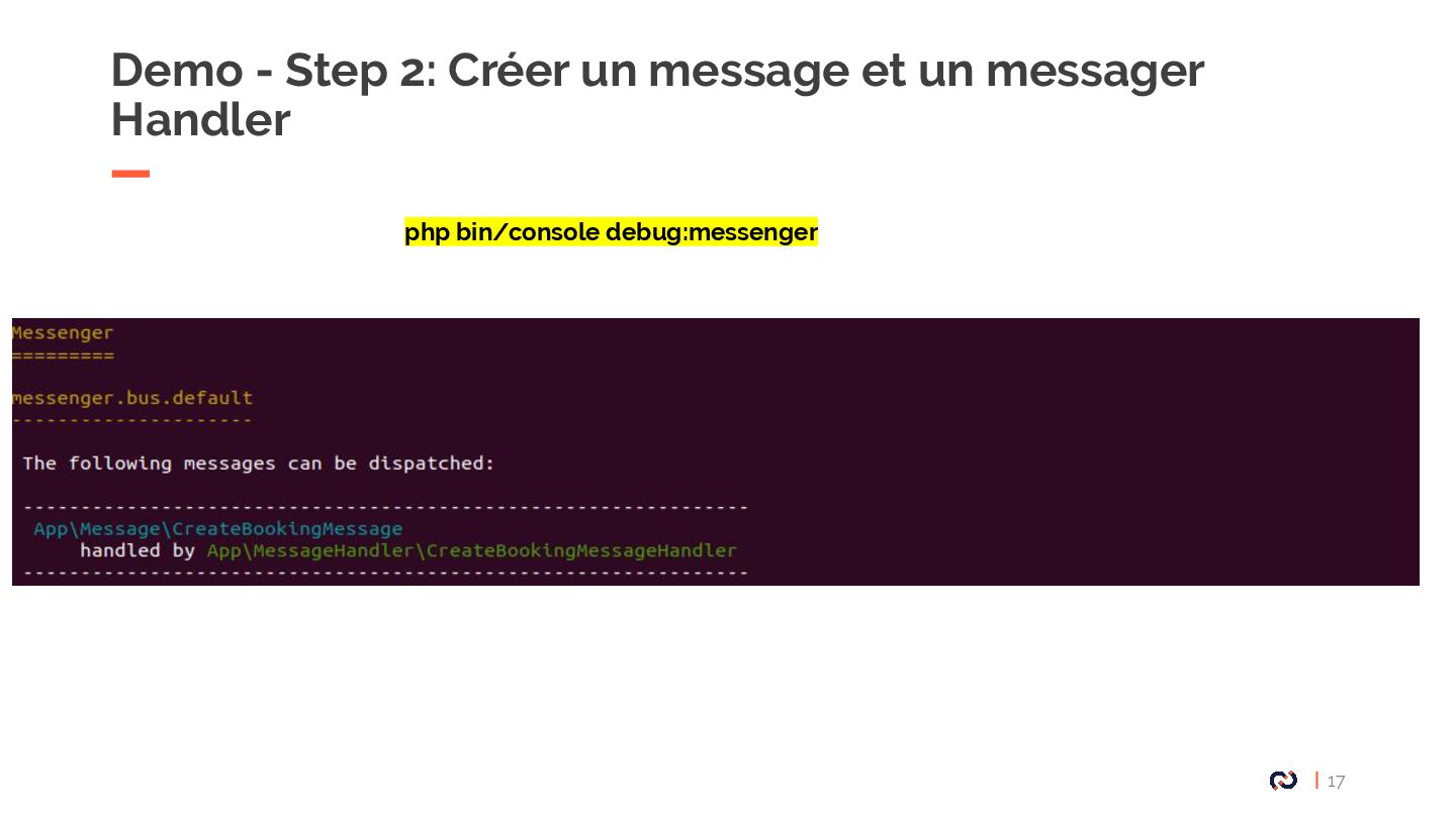 • Message : Un objet DTO serializable, notre Commande. • Enveloppe: metadata, stamps. • Bus : collections de middlewares CommandBus, QueryBus, EventBus: La plupart des gens utilisent Messenger comme un "bus de commande". • Midelwars: dispatcher le message, sérialisation/désérialisation, exécuter le handler approprié. (senderMidellware / Handler Middleware) • Handler(worker) : La classe qui va recevoir un message à exécuter. • Transport: Il permet de faire transiter les messages via différents broker. • Receiver : Deserialize le message reçu via le bus et le transmet au bon handler. • Sender : Serialize le message et le transmet au queue manager via le bus. • Data collector : une service for debugging on DEV permet d’avoir les messages dispatché sur le profiler