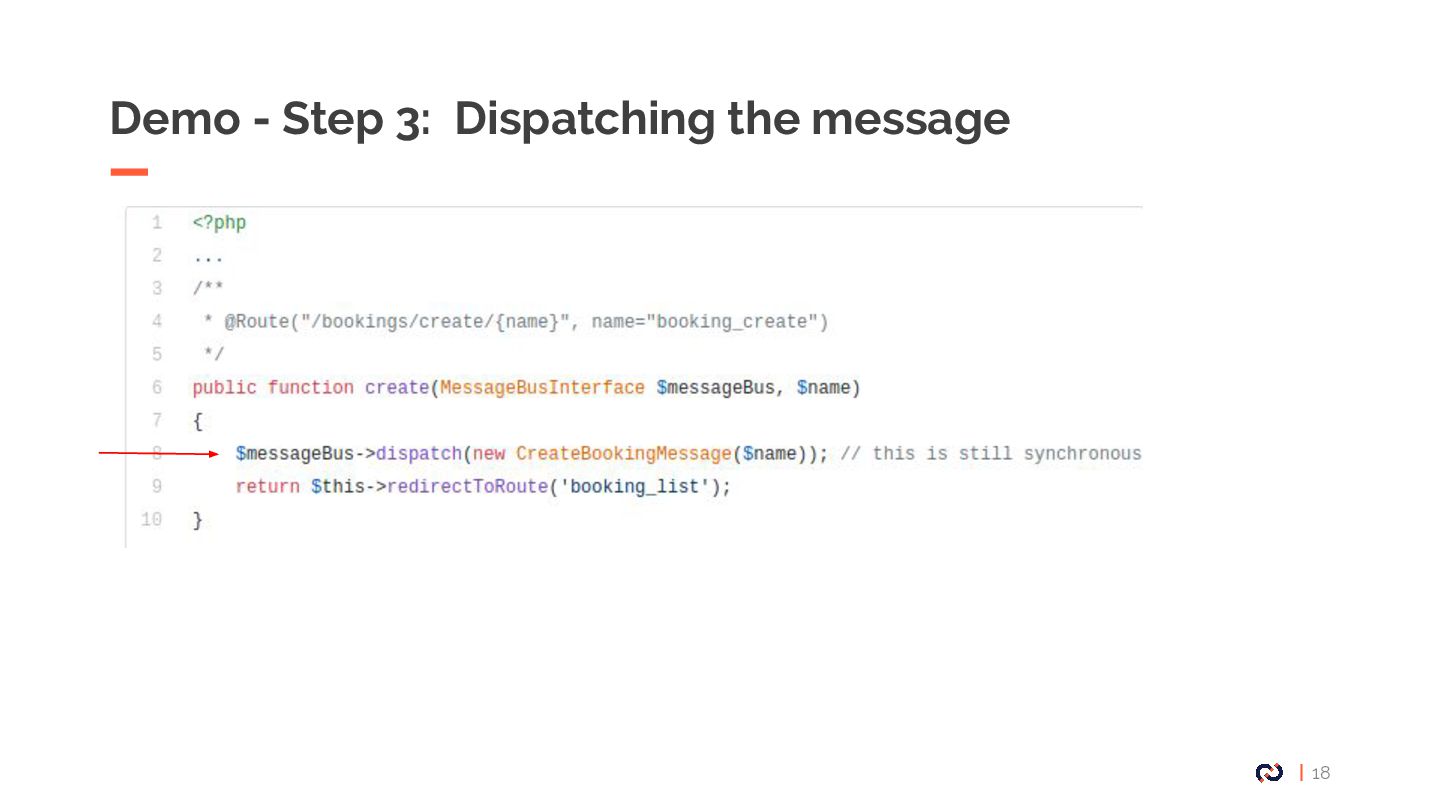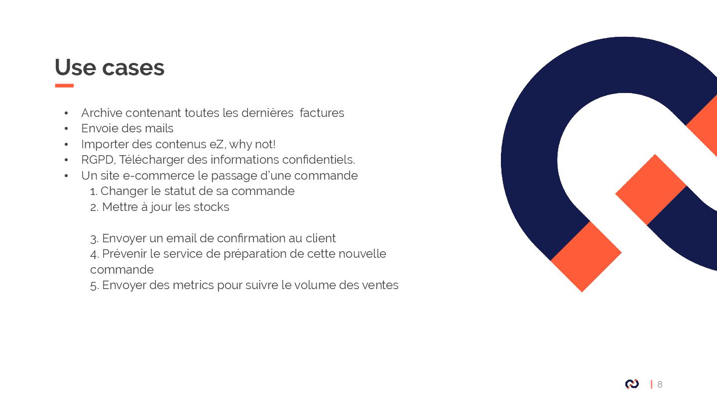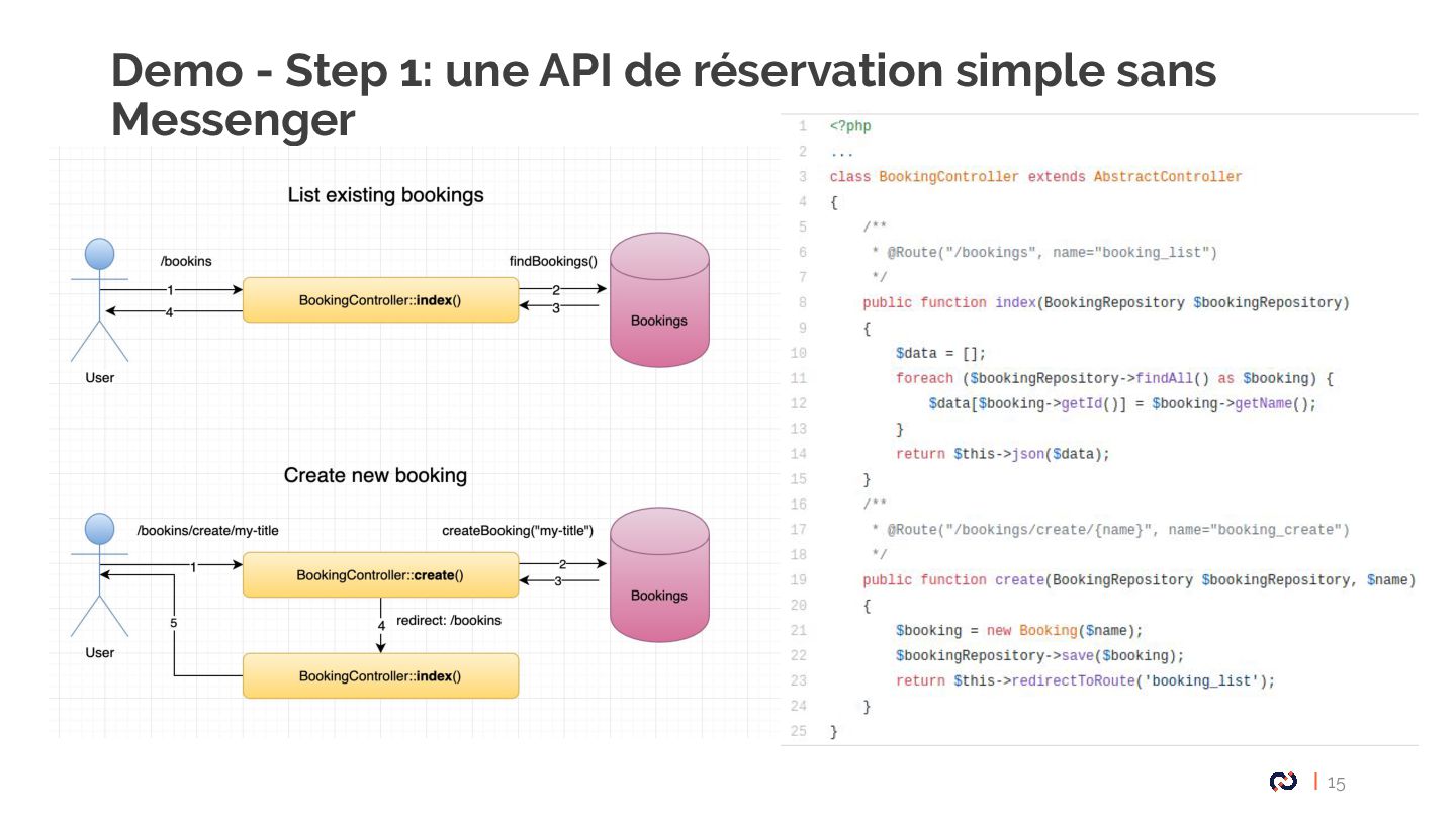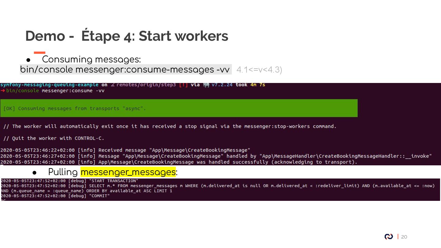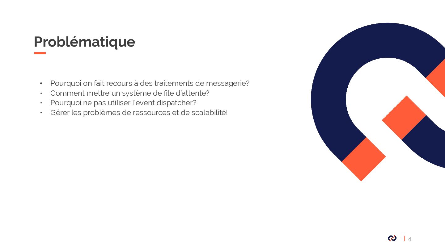 • Message : Un objet DTO serializable, notre Commande. • Enveloppe: metadata, stamps. • Bus : collections de middlewares CommandBus, QueryBus, EventBus: La plupart des gens utilisent Messenger comme un "bus de commande". • Midelwars: dispatcher le message, sérialisation/désérialisation, exécuter le handler approprié. (senderMidellware / Handler Middleware) • Handler(worker) : La classe qui va recevoir un message à exécuter. • Transport: Il permet de faire transiter les messages via différents broker. • Receiver : Deserialize le message reçu via le bus et le transmet au bon handler. • Sender : Serialize le message et le transmet au queue manager via le bus. • Data collector : une service for debugging on DEV permet d’avoir les messages dispatché sur le profiler