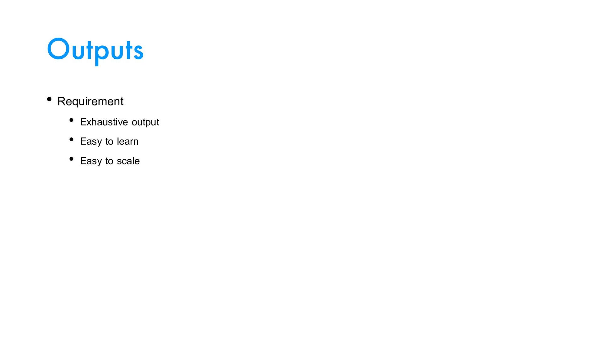 Outputs • Requirement • Exhaustive output • Easy to learn