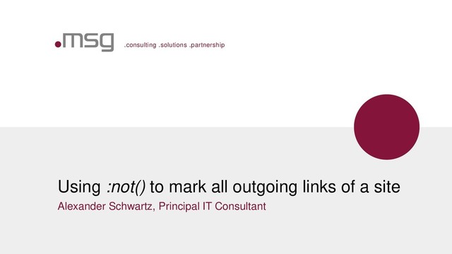 msg | March 2019 | Using :not() to mark all outgoing links of a site | Alexander Schwartz 3 <a href="https://jamstack.org/">JAMstack</a> <a href="/aboutme">contact me via a direct message on twitter or via email</a> <a itemprop="url" title="Twitter" target="_blank" href="https://twitter.com/intent/..." rel="noopener" class="button is-info">Tweet</span></a> External Link, same window: add mark Button, external link: no mark Internal Link: no mark
