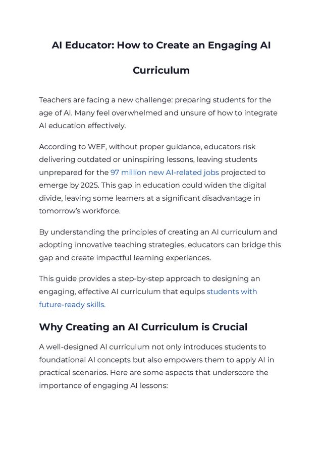 are facing a new challenge: preparing students for the age of AI. Many feel overwhelmed and unsure of how to integrate AI education effectively. According to WEF, without proper guidance, educators risk delivering outdated or uninspiring lessons, leaving students unprepared for the 97 million new AI-related jobs projected to emerge by 2025. This gap in education could widen the digital divide, leaving some learners at a significant disadvantage in tomorrow’s workforce. By understanding the principles of creating an AI curriculum and adopting innovative teaching strategies, educators can bridge this gap and create impactful learning experiences. This guide provides a step-by-step approach to designing an engaging, effective AI curriculum that equips students with future-ready skills. Why Creating an AI Curriculum is Crucial A well-designed AI curriculum not only introduces students to foundational AI concepts but also empowers them to apply AI in practical scenarios. Here are some aspects that underscore the importance of engaging AI lessons: