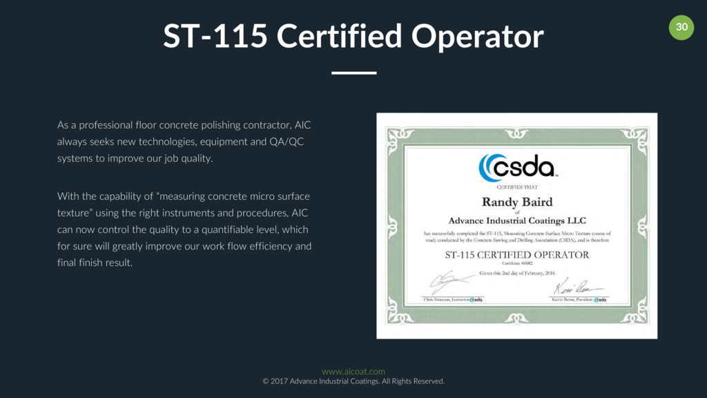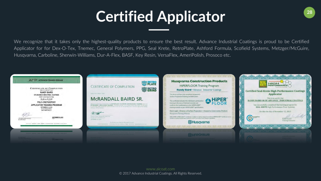 Our Operations Manager Randy Baird Sr. has over 30 years of diverse industrial flooring coating experience that includes epoxy systems, concrete polishing, floor demolition/removals, concrete surface preparation, resurfacing, acid stains/dyes, diamond grinding, shot blasting, and joint/crack repairs. Randy has performed industrial flooring coatings project management services in addition to providing cost accounting, safety oversight, scheduling and production staffing. As a floor coating project manager, Randy has honed his skills in the supervision of work crews, mobilization/demobilization, planning, estimating, scheduling, employee training, and project QC documentation. Randy is a certified coatings installer for: Dex-O-Tex, Tnemec, General Polymers, PPG, Seal Krete, RetroPlate, Ashford Formula, Scofield Systems, Metzger/McGuire, Husqvarna, Carboline, Sherwin-Williams, Dur-A-Flex, BASF, Key Resin, VersaFlex, AmeriPolish, Prosoco etc. Meet Randy