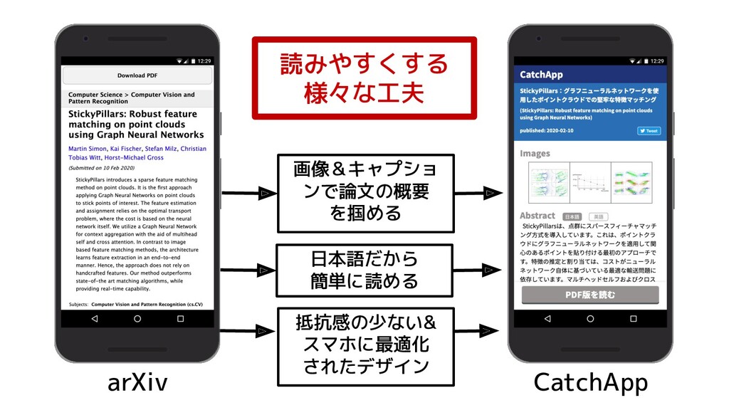 CatchAppは、読むべき論文をサクサク探せるサービスです! これを使えば堅苦しいサイトで論文を探す必要も、翻訳ツールを行き来する必要もありません。 自動で論文の画像と図説を抜き出し、タイトルやアブストラクトを翻訳する機能があるので、移動中でもスマホを使って手軽に論文が探せます。