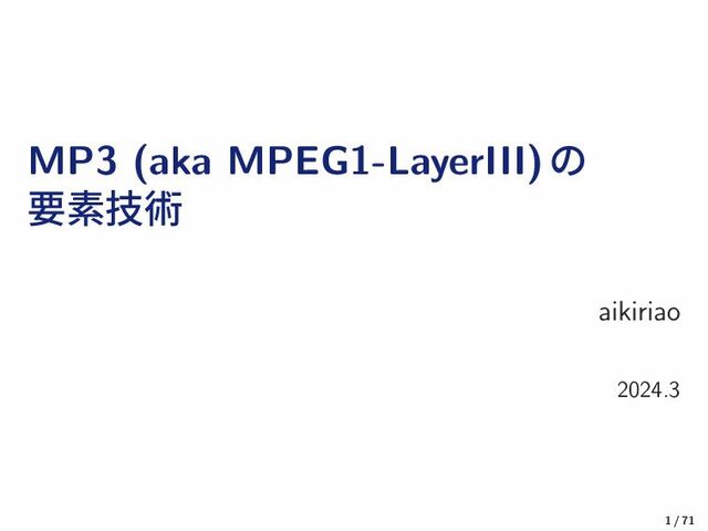 36 n + 1 2 (n = 0, ..., 35) short w[n] = sin π 12 n − 6k + 1 2 (k = 1, 2, 3, n = 6k, ..., 6k + 11) start w[n] = sin π 36 n + 1 2 (n = 0, ..., 17) 1 (n = 18, ..., 23) sin π 12 n − 18 + 1 2 (n = 24, ..., 29) 0 (n = 30, ..., 35) stop w[n] = 0 (n = 0, ..., 5) sin π 12 n − 6 + 1 2 (n = 6, ..., 11) 1 (n = 12, ..., 17) sin π 36 n + 1 2 (n = 18, ..., 35) ▶ short ͷ૭ 12ɼͦΕҎ֎ 36 29 / 71