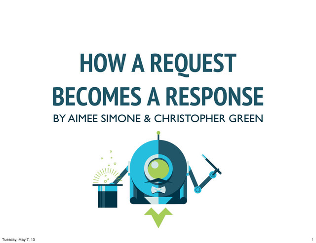 REQUEST MADE: GET http://codeschool.com/courses REQUEST ACCEPTED, PASSED TO APPLICATION SERVER APPLICATION SERVER GIVES REQUEST TO MIDDLEWARE, RAILS IS STARTED, GETS REQUEST. 43 Tuesday, May 7, 13