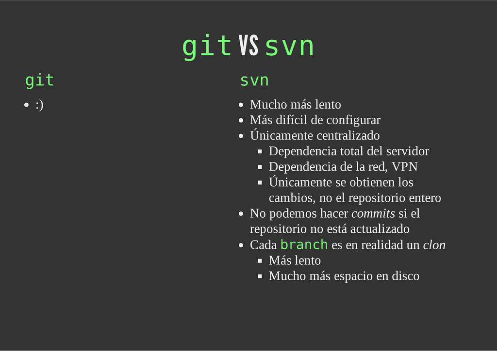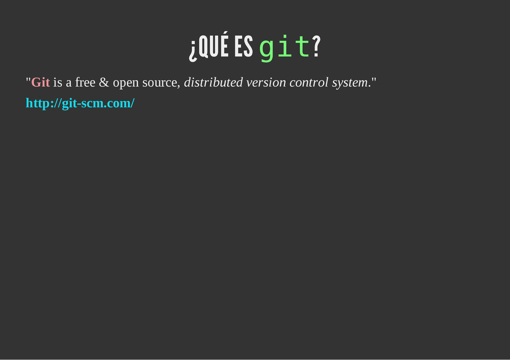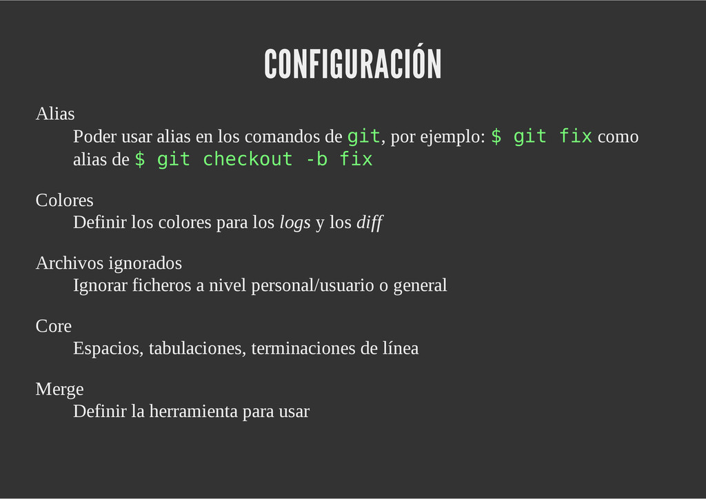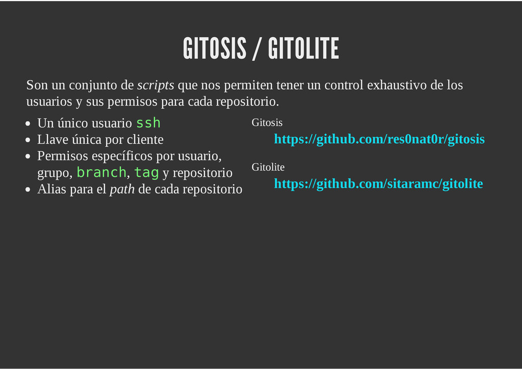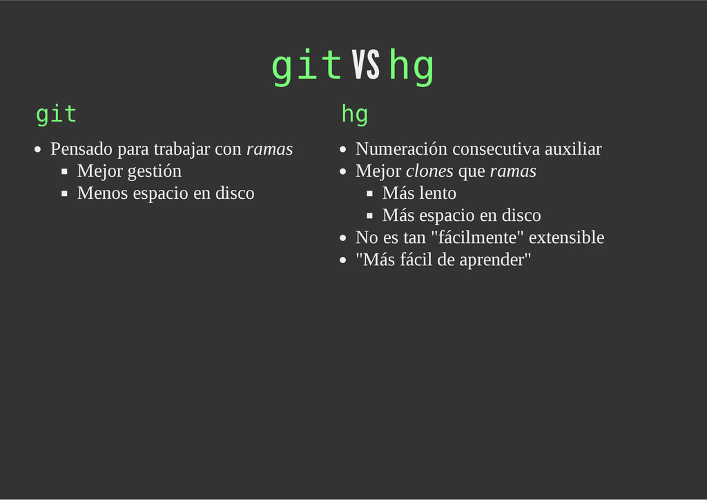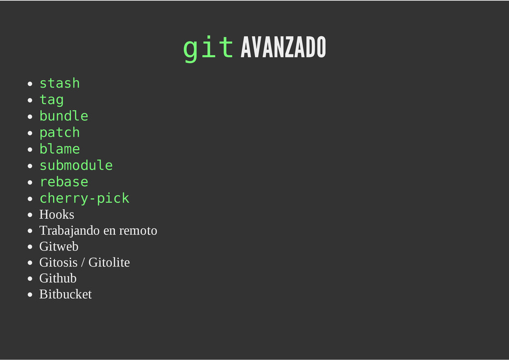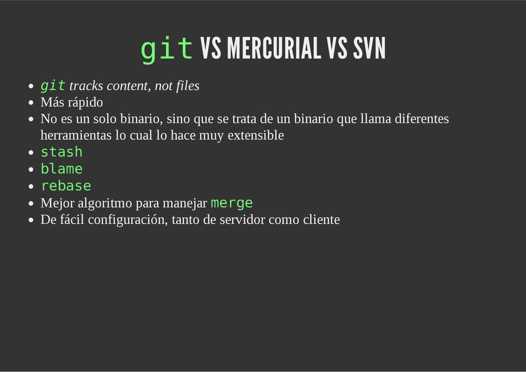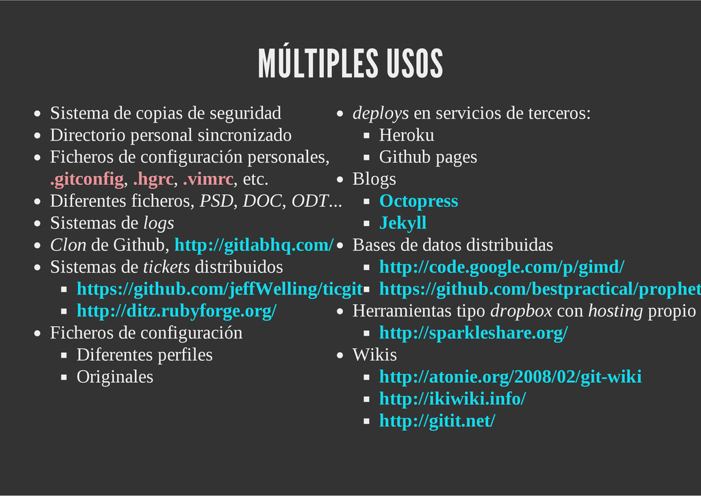 configuración personales, .gitconfig, .hgrc, .vimrc, etc. Diferentes ficheros, PSD, DOC, ODT... Sistemas de logs Clon de Github, http://gitlabhq.com/ Sistemas de tickets distribuidos https://github.com/jeffWelling/ticgit http://ditz.rubyforge.org/ Ficheros de configuración Diferentes perfiles Originales deploys en servicios de terceros: Heroku Github pages Blogs Octopress Jekyll Bases de datos distribuidas http://code.google.com/p/gimd/ https://github.com/bestpractical/prophet Herramientas tipo dropbox con hosting propio http://sparkleshare.org/ Wikis http://atonie.org/2008/02/gitwiki http://ikiwiki.info/ http://gitit.net/ MÚLTIPLES USOS