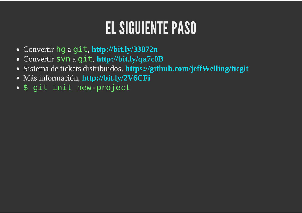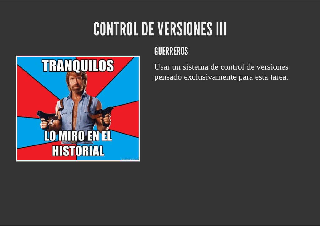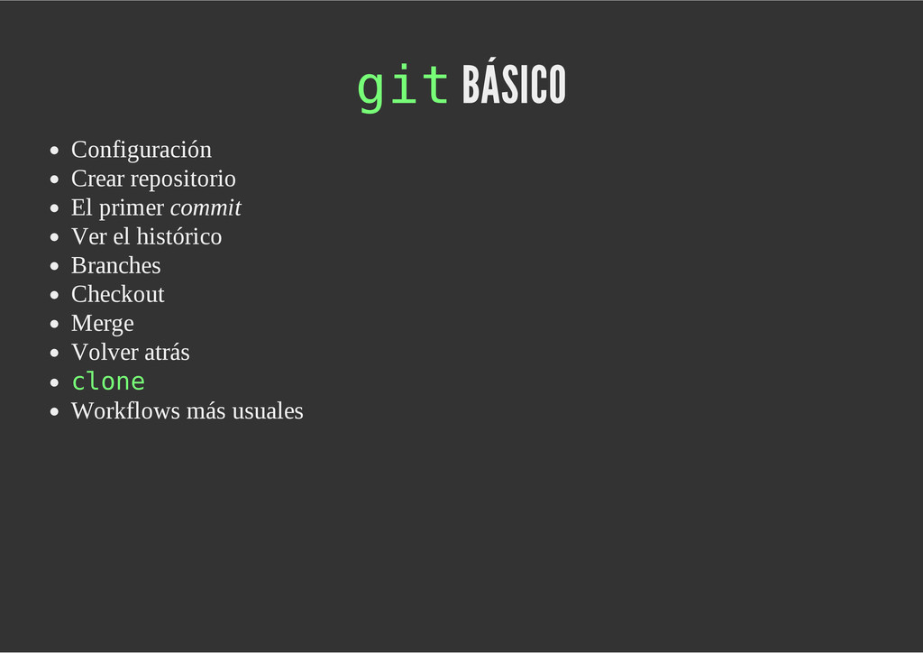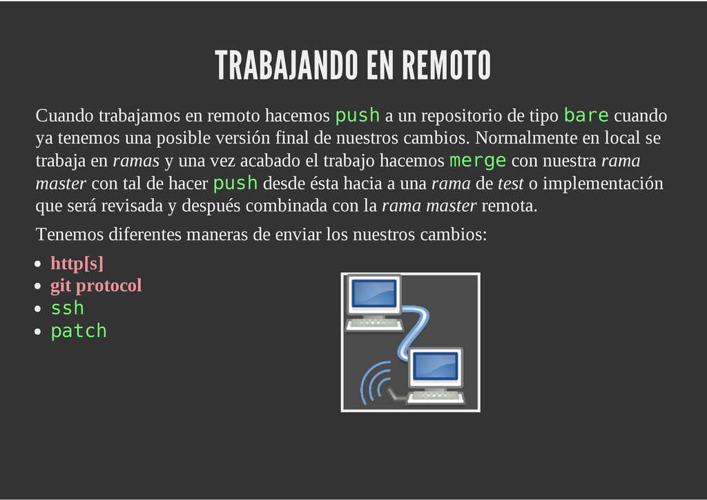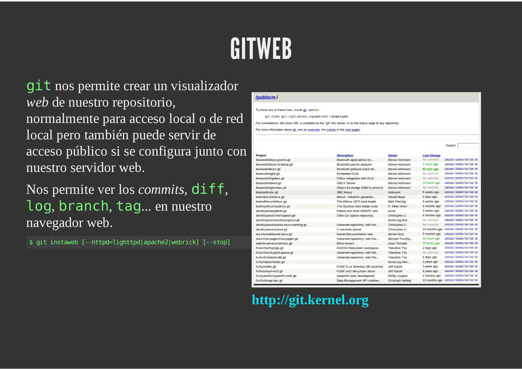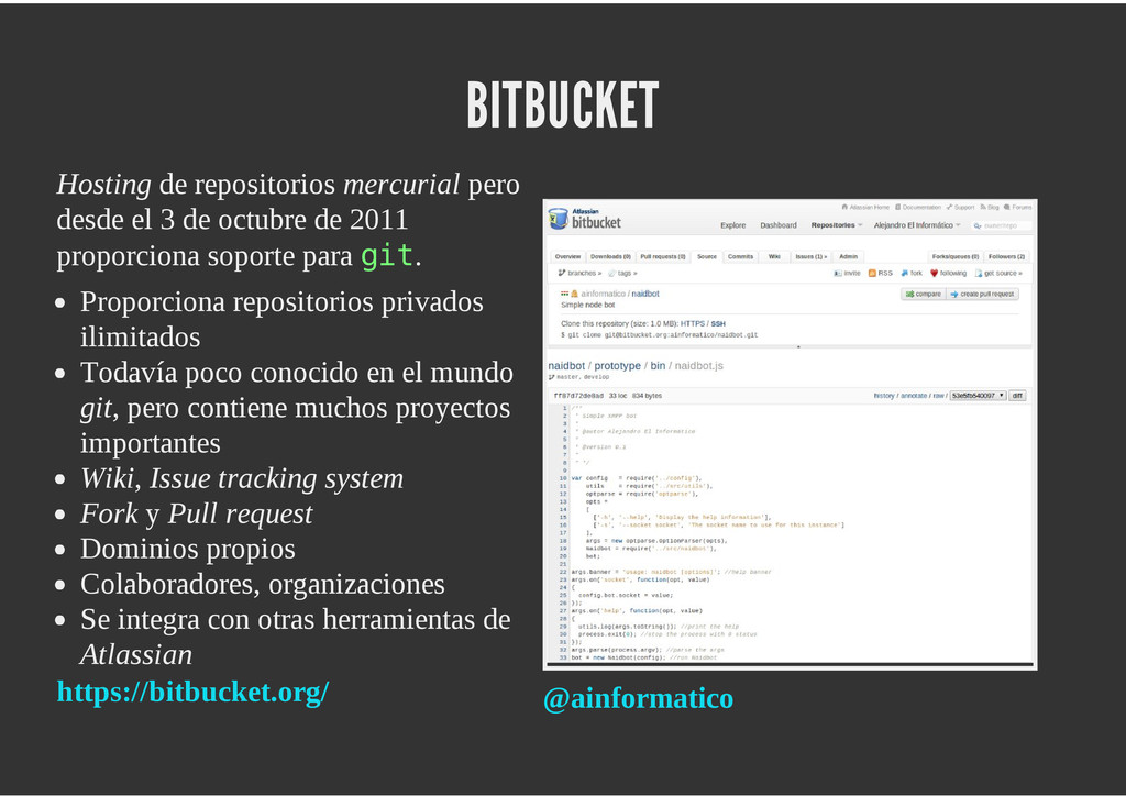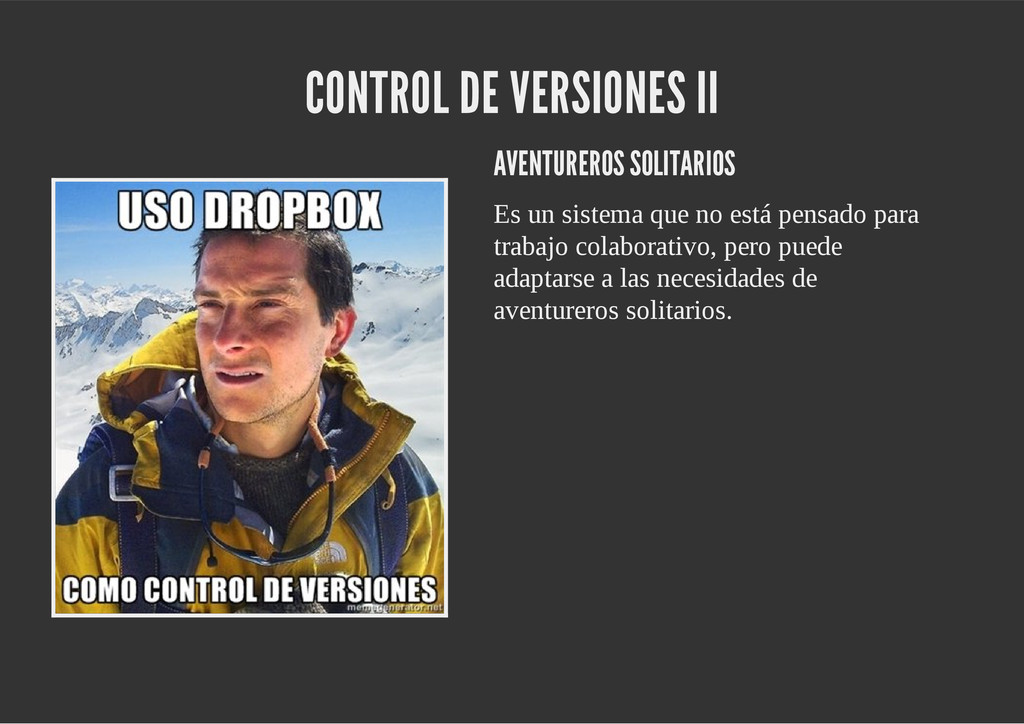 configuración personales, .gitconfig, .hgrc, .vimrc, etc. Diferentes ficheros, PSD, DOC, ODT... Sistemas de logs Clon de Github, http://gitlabhq.com/ Sistemas de tickets distribuidos https://github.com/jeffWelling/ticgit http://ditz.rubyforge.org/ Ficheros de configuración Diferentes perfiles Originales deploys en servicios de terceros: Heroku Github pages Blogs Octopress Jekyll Bases de datos distribuidas http://code.google.com/p/gimd/ https://github.com/bestpractical/prophet Herramientas tipo dropbox con hosting propio http://sparkleshare.org/ Wikis http://atonie.org/2008/02/gitwiki http://ikiwiki.info/ http://gitit.net/ MÚLTIPLES USOS
