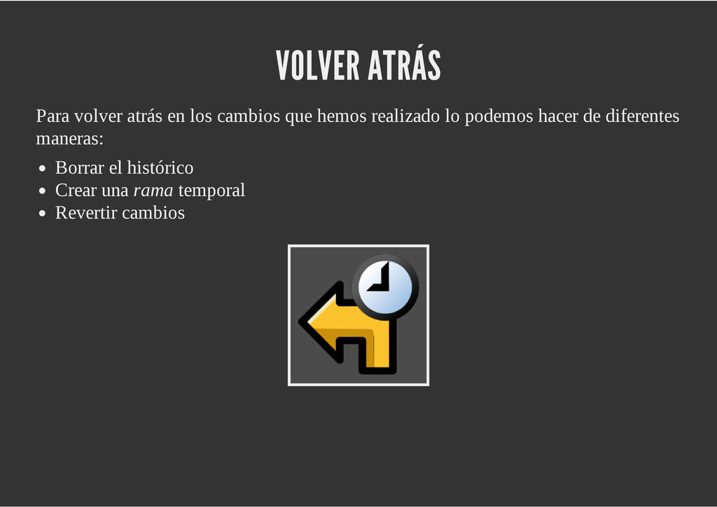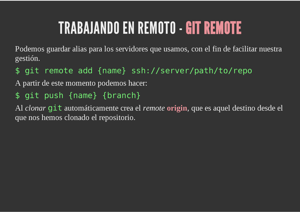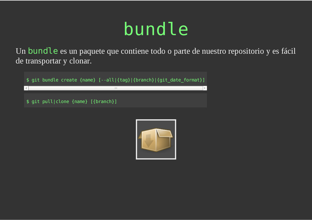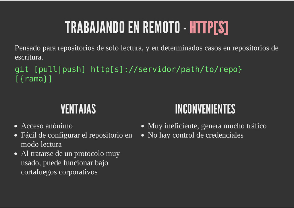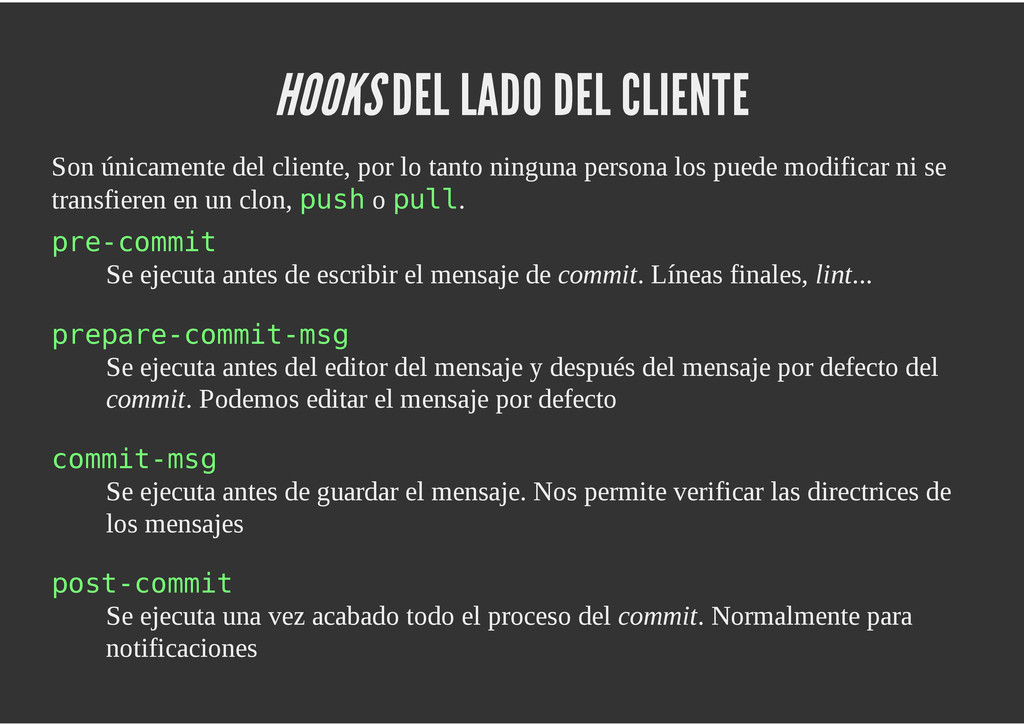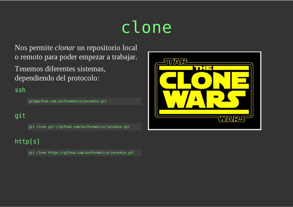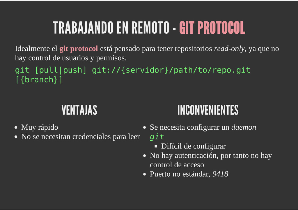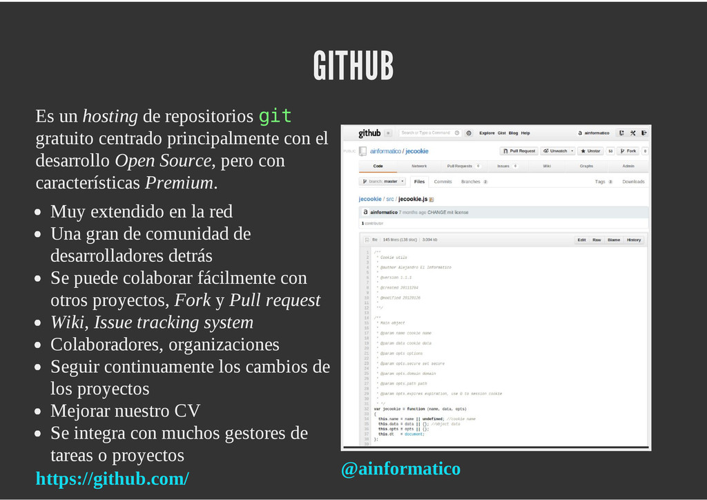 configuración personales, .gitconfig, .hgrc, .vimrc, etc. Diferentes ficheros, PSD, DOC, ODT... Sistemas de logs Clon de Github, http://gitlabhq.com/ Sistemas de tickets distribuidos https://github.com/jeffWelling/ticgit http://ditz.rubyforge.org/ Ficheros de configuración Diferentes perfiles Originales deploys en servicios de terceros: Heroku Github pages Blogs Octopress Jekyll Bases de datos distribuidas http://code.google.com/p/gimd/ https://github.com/bestpractical/prophet Herramientas tipo dropbox con hosting propio http://sparkleshare.org/ Wikis http://atonie.org/2008/02/gitwiki http://ikiwiki.info/ http://gitit.net/ MÚLTIPLES USOS