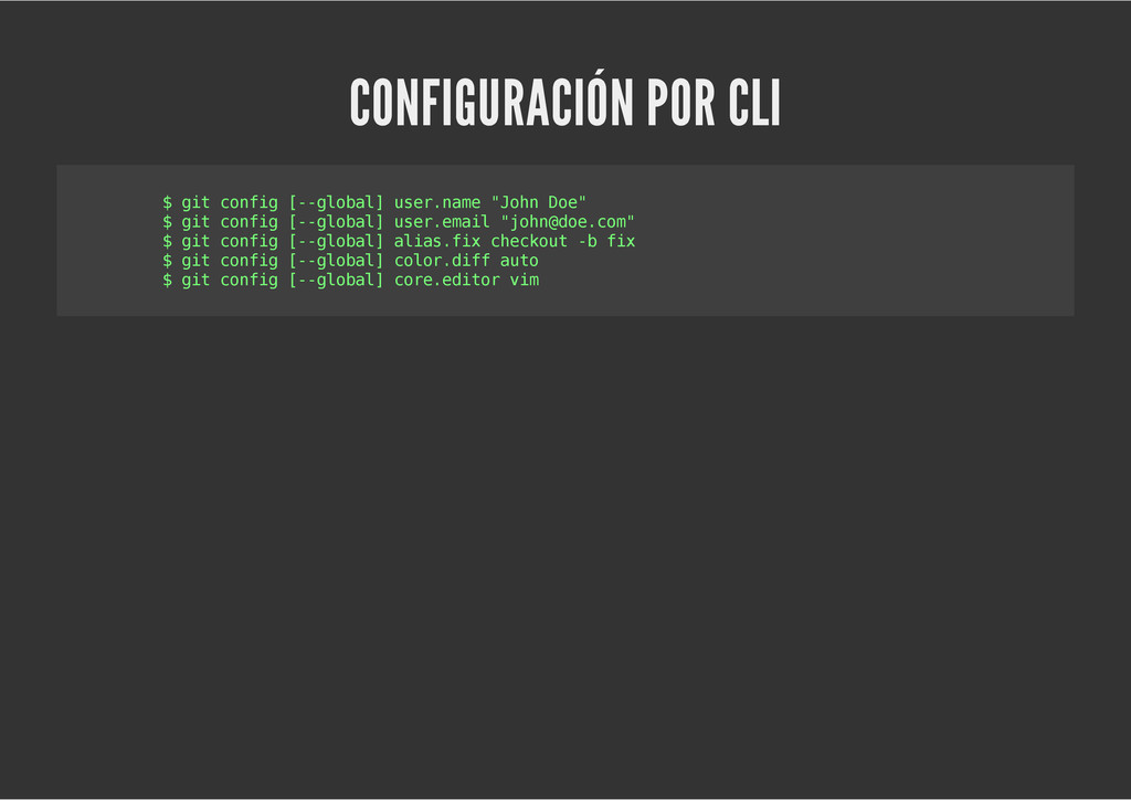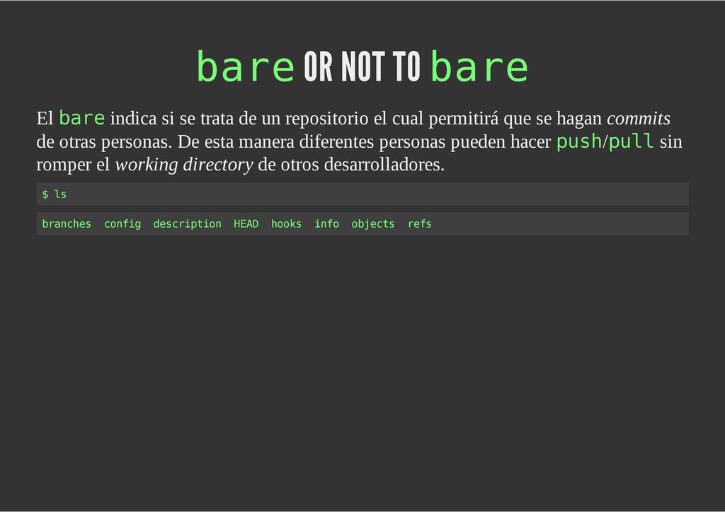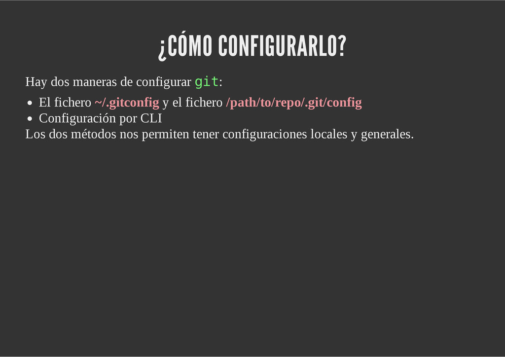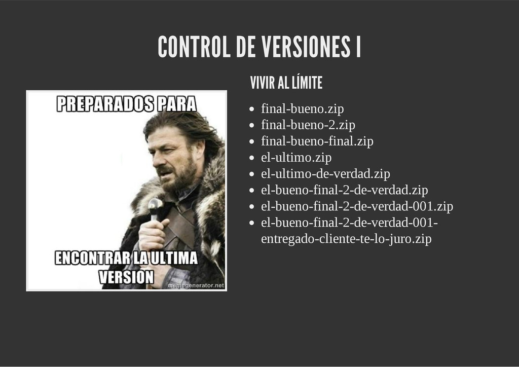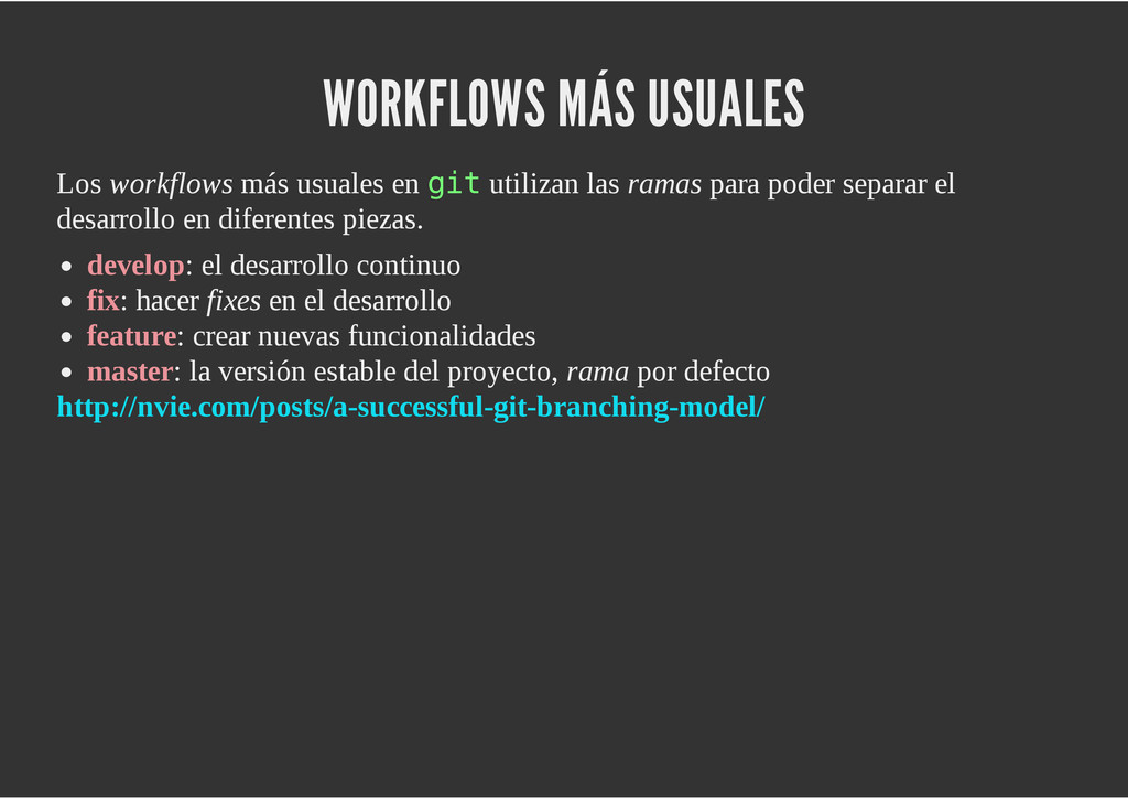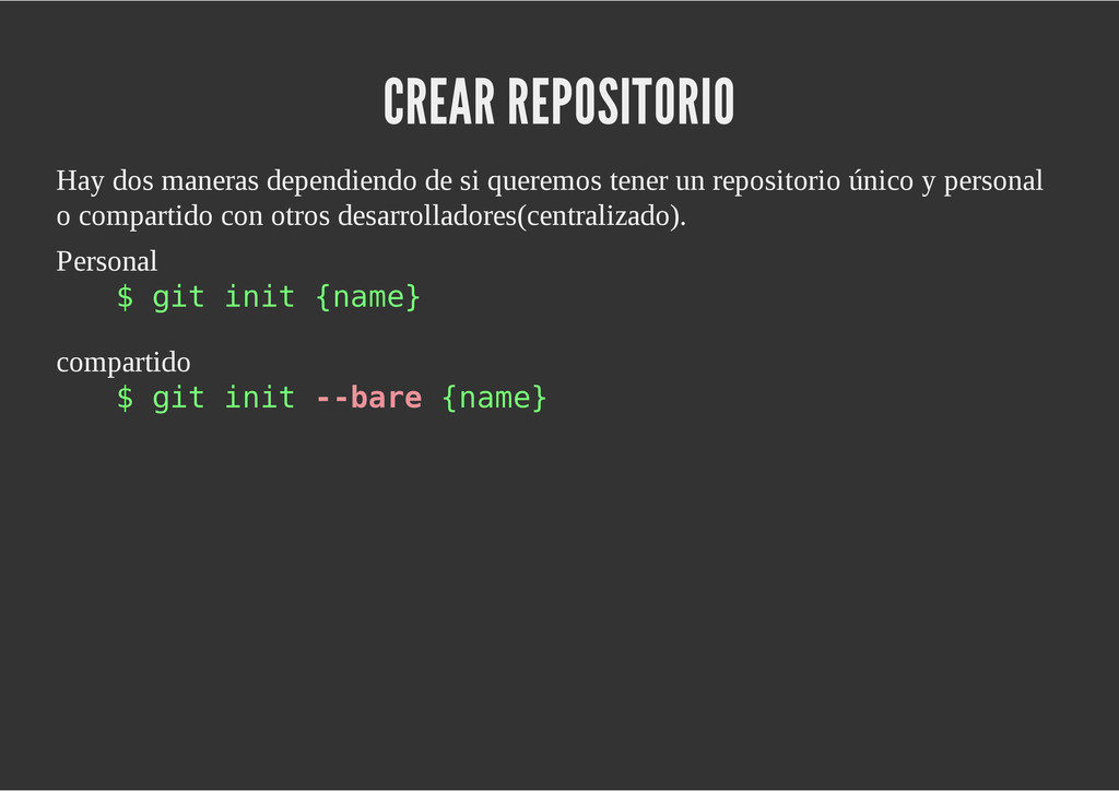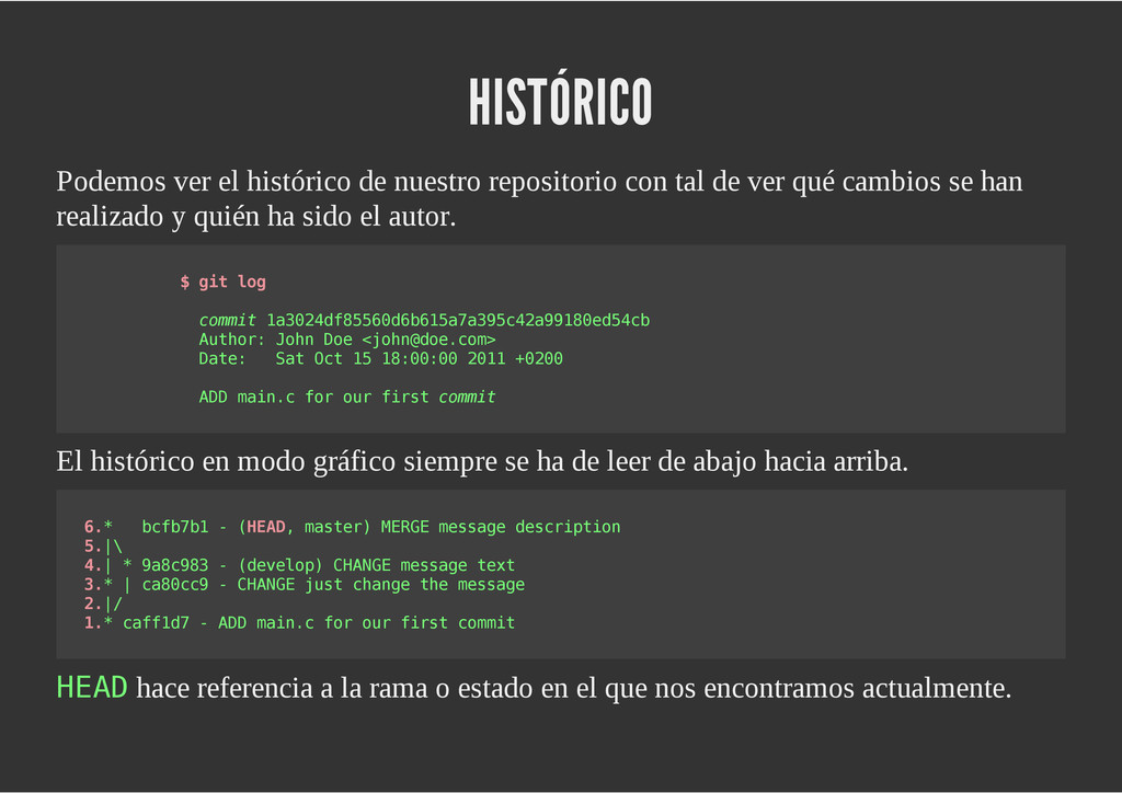 configuración personales, .gitconfig, .hgrc, .vimrc, etc. Diferentes ficheros, PSD, DOC, ODT... Sistemas de logs Clon de Github, http://gitlabhq.com/ Sistemas de tickets distribuidos https://github.com/jeffWelling/ticgit http://ditz.rubyforge.org/ Ficheros de configuración Diferentes perfiles Originales deploys en servicios de terceros: Heroku Github pages Blogs Octopress Jekyll Bases de datos distribuidas http://code.google.com/p/gimd/ https://github.com/bestpractical/prophet Herramientas tipo dropbox con hosting propio http://sparkleshare.org/ Wikis http://atonie.org/2008/02/gitwiki http://ikiwiki.info/ http://gitit.net/ MÚLTIPLES USOS