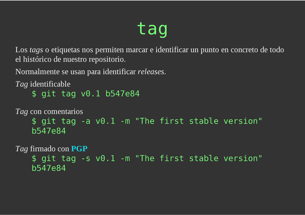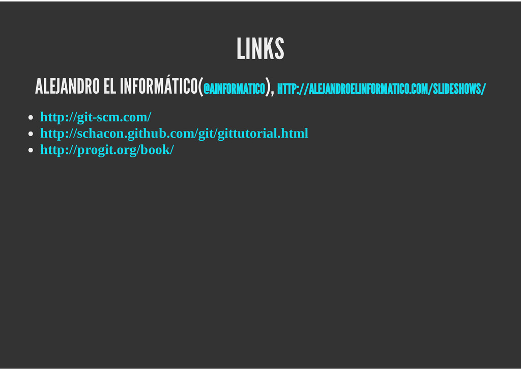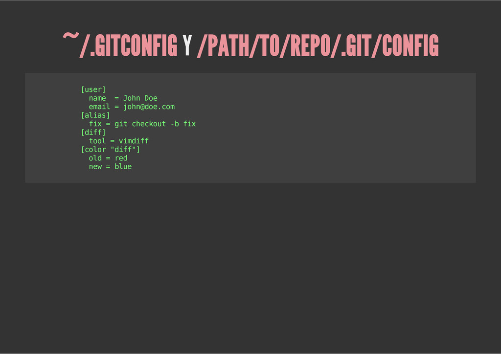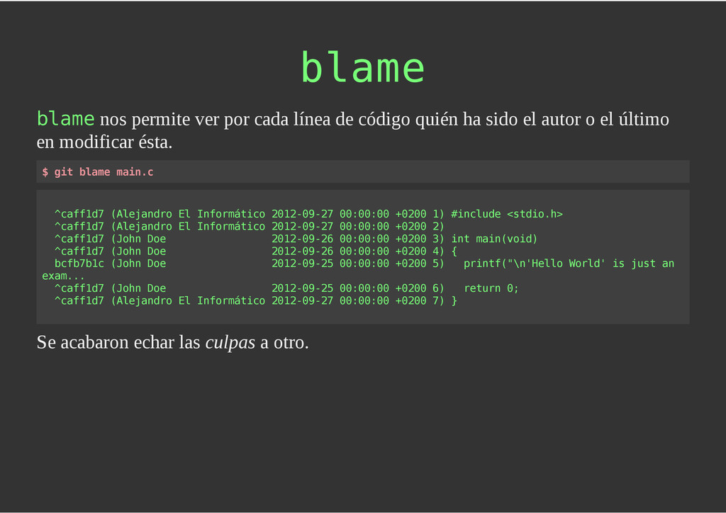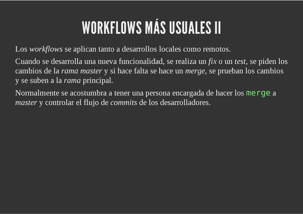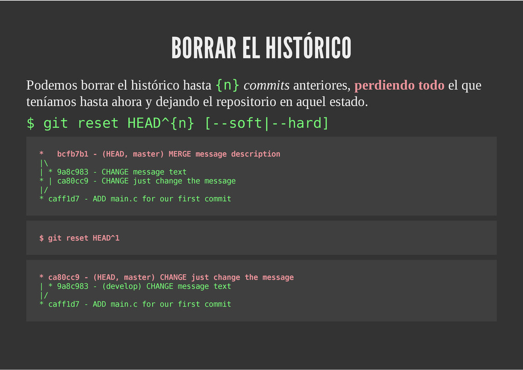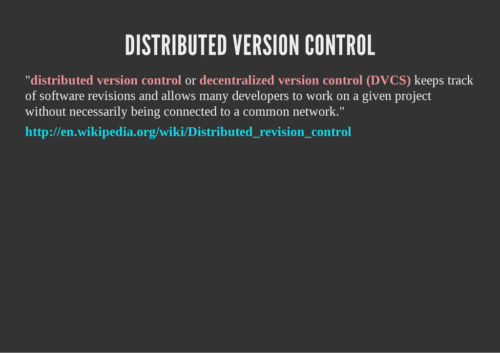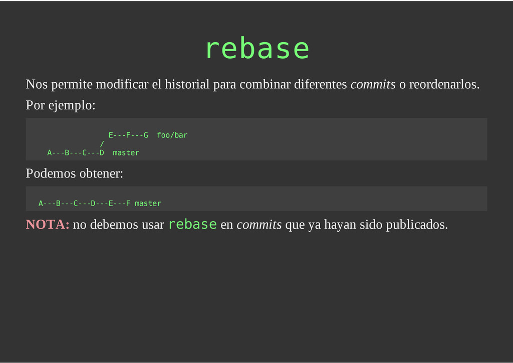 configuración personales, .gitconfig, .hgrc, .vimrc, etc. Diferentes ficheros, PSD, DOC, ODT... Sistemas de logs Clon de Github, http://gitlabhq.com/ Sistemas de tickets distribuidos https://github.com/jeffWelling/ticgit http://ditz.rubyforge.org/ Ficheros de configuración Diferentes perfiles Originales deploys en servicios de terceros: Heroku Github pages Blogs Octopress Jekyll Bases de datos distribuidas http://code.google.com/p/gimd/ https://github.com/bestpractical/prophet Herramientas tipo dropbox con hosting propio http://sparkleshare.org/ Wikis http://atonie.org/2008/02/gitwiki http://ikiwiki.info/ http://gitit.net/ MÚLTIPLES USOS