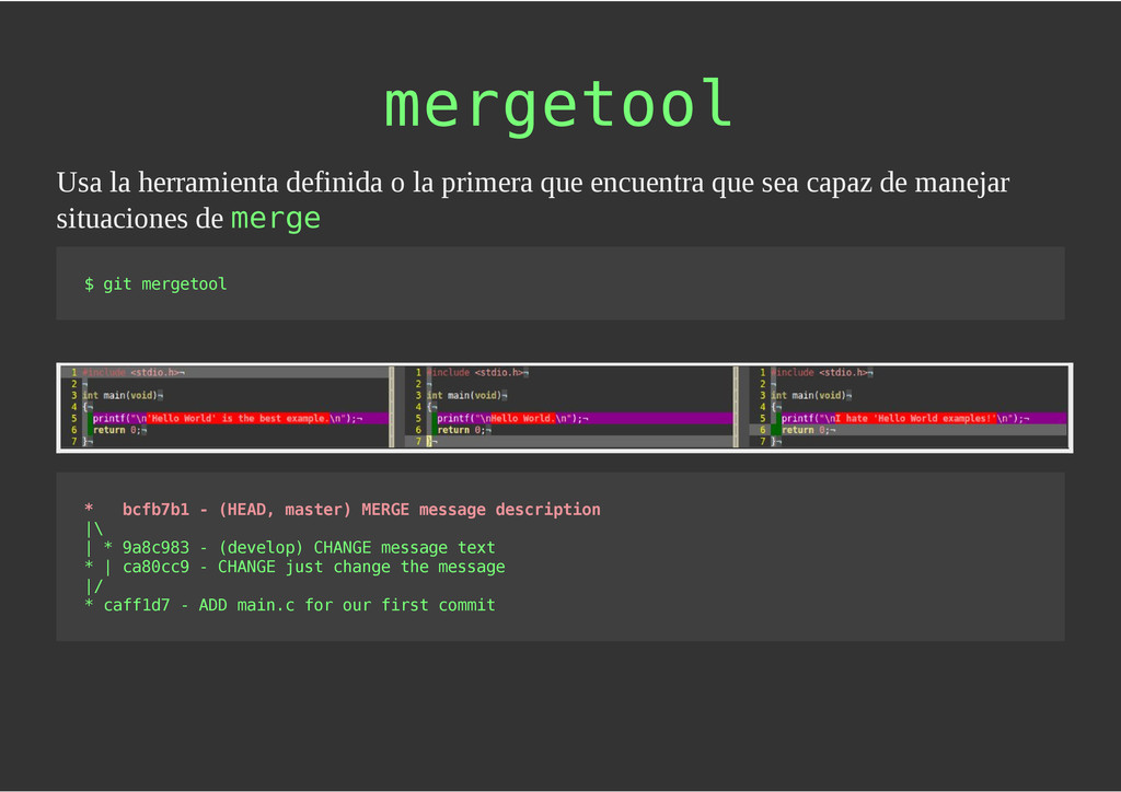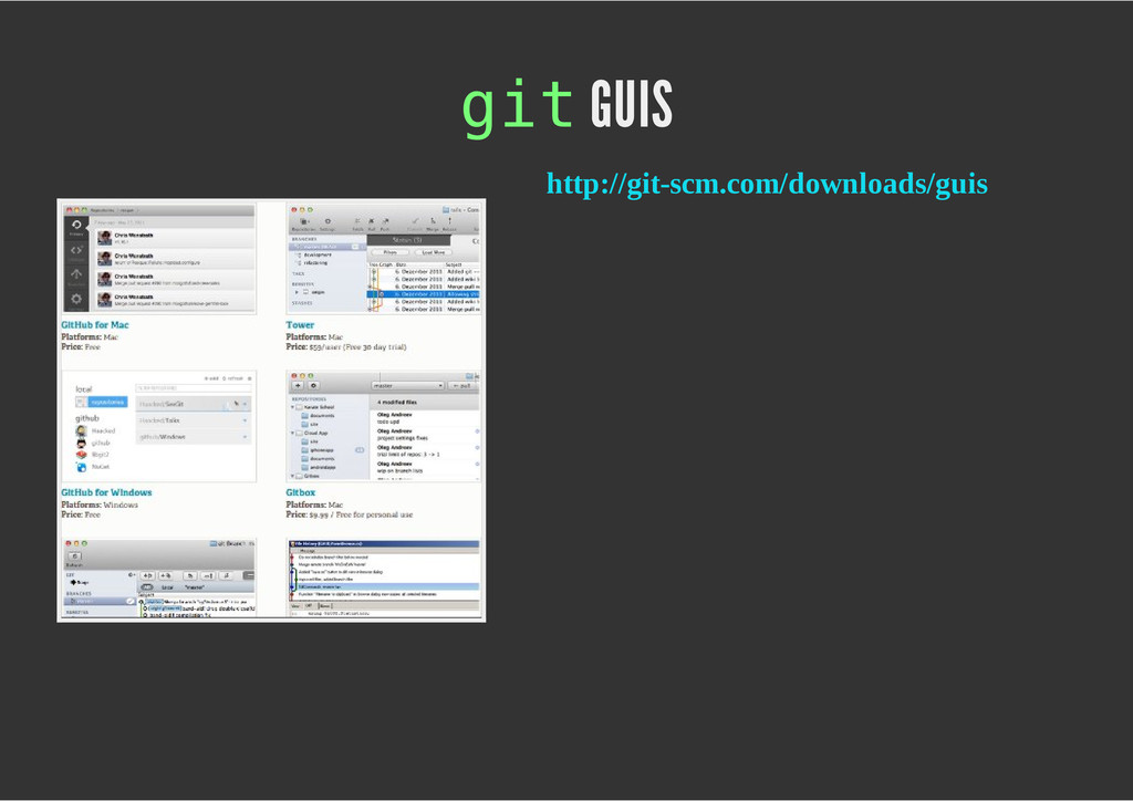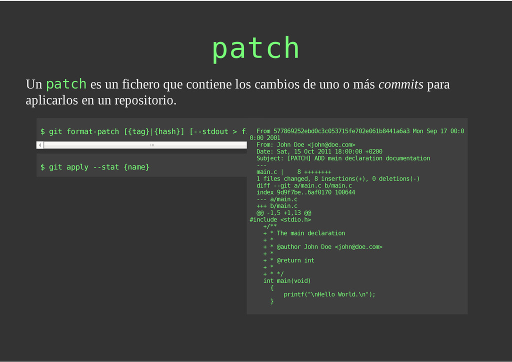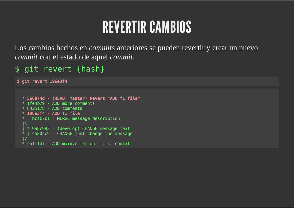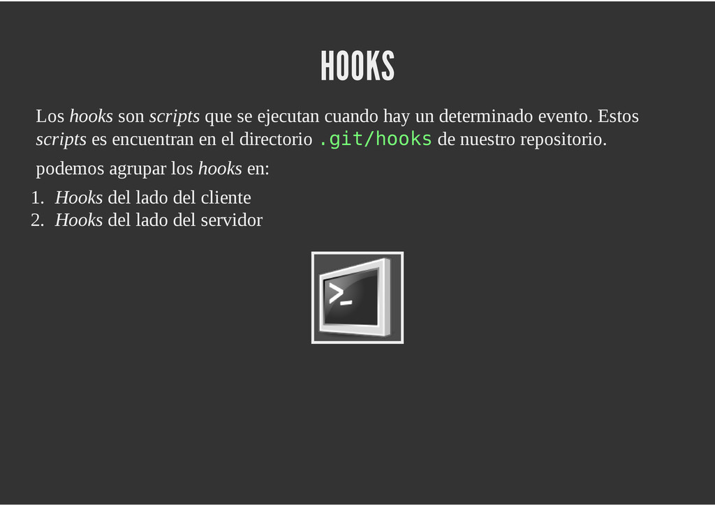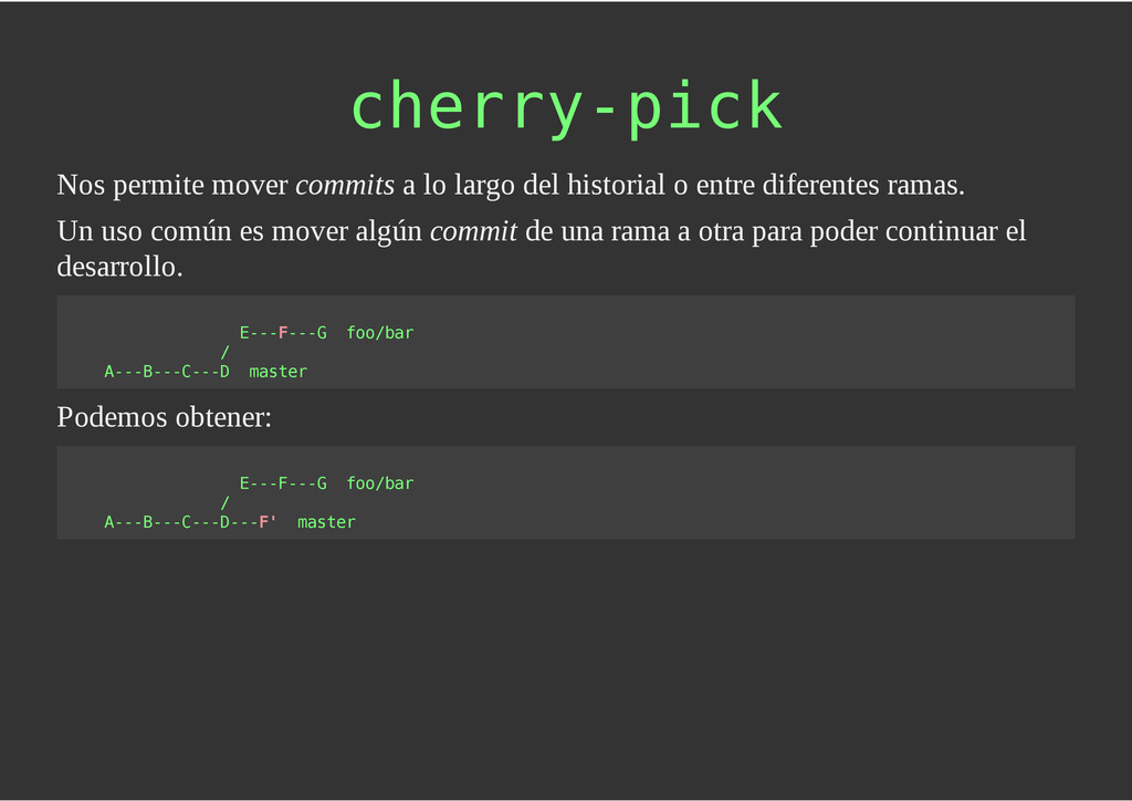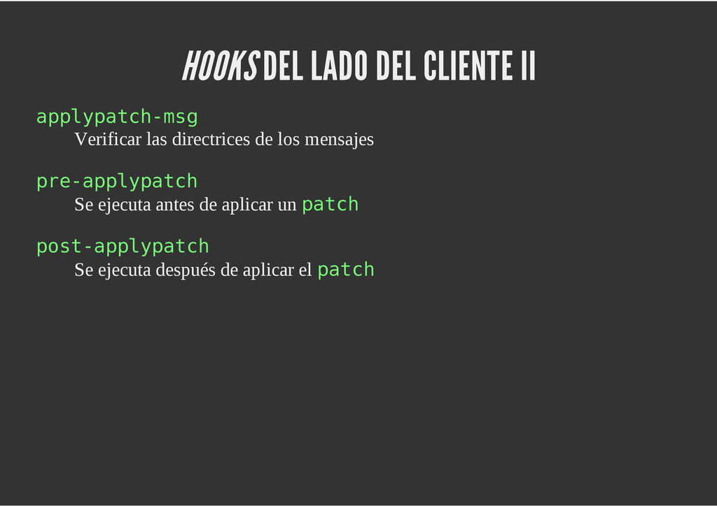 configuración personales, .gitconfig, .hgrc, .vimrc, etc. Diferentes ficheros, PSD, DOC, ODT... Sistemas de logs Clon de Github, http://gitlabhq.com/ Sistemas de tickets distribuidos https://github.com/jeffWelling/ticgit http://ditz.rubyforge.org/ Ficheros de configuración Diferentes perfiles Originales deploys en servicios de terceros: Heroku Github pages Blogs Octopress Jekyll Bases de datos distribuidas http://code.google.com/p/gimd/ https://github.com/bestpractical/prophet Herramientas tipo dropbox con hosting propio http://sparkleshare.org/ Wikis http://atonie.org/2008/02/gitwiki http://ikiwiki.info/ http://gitit.net/ MÚLTIPLES USOS