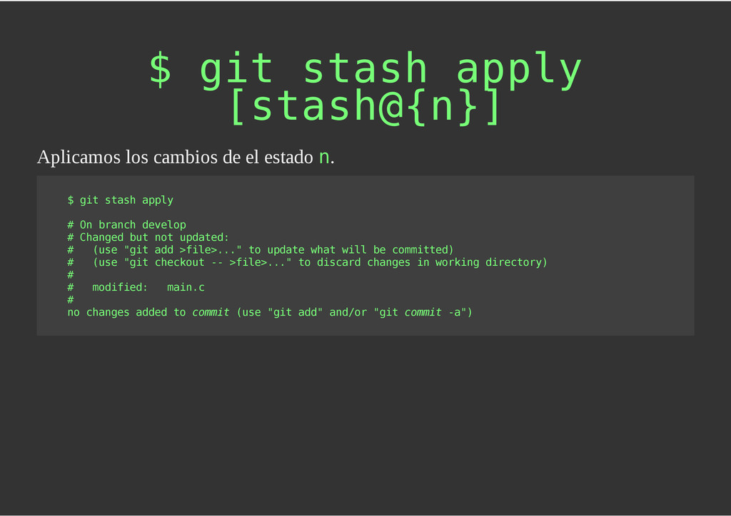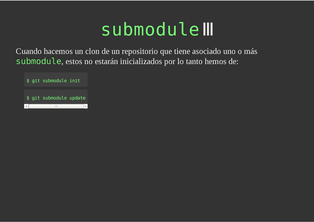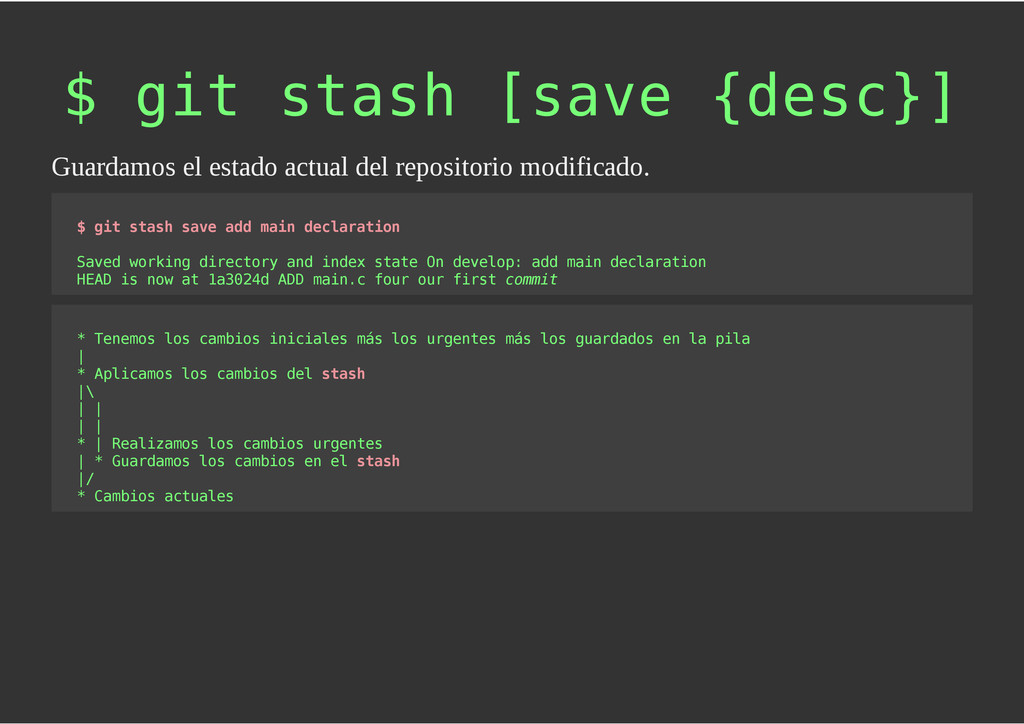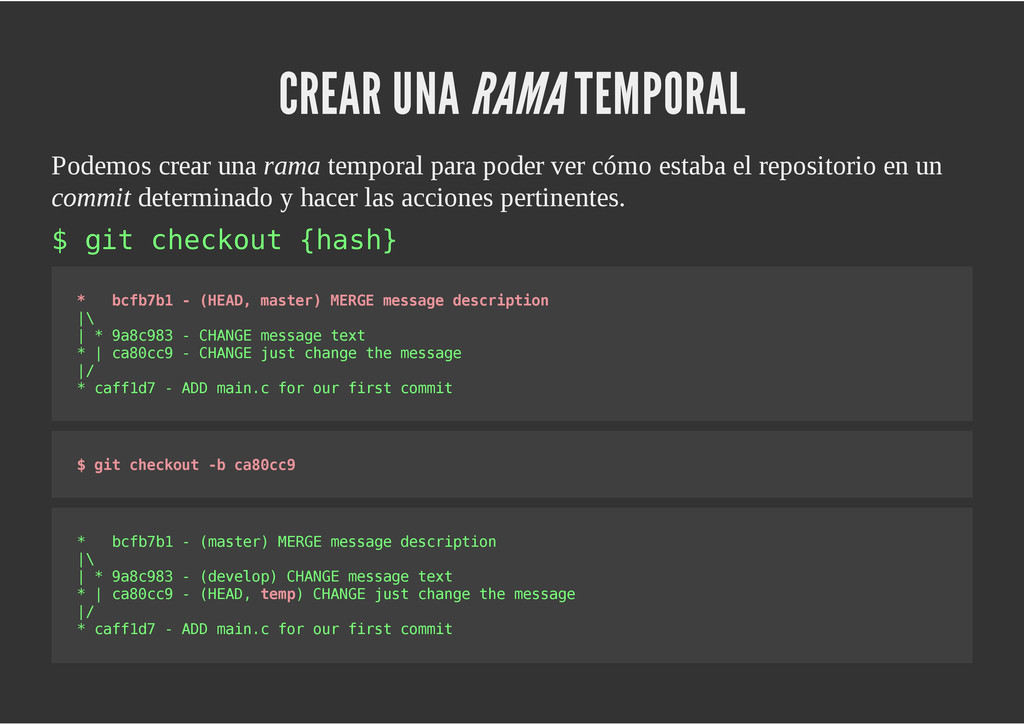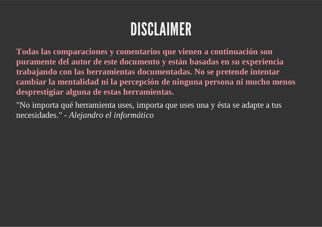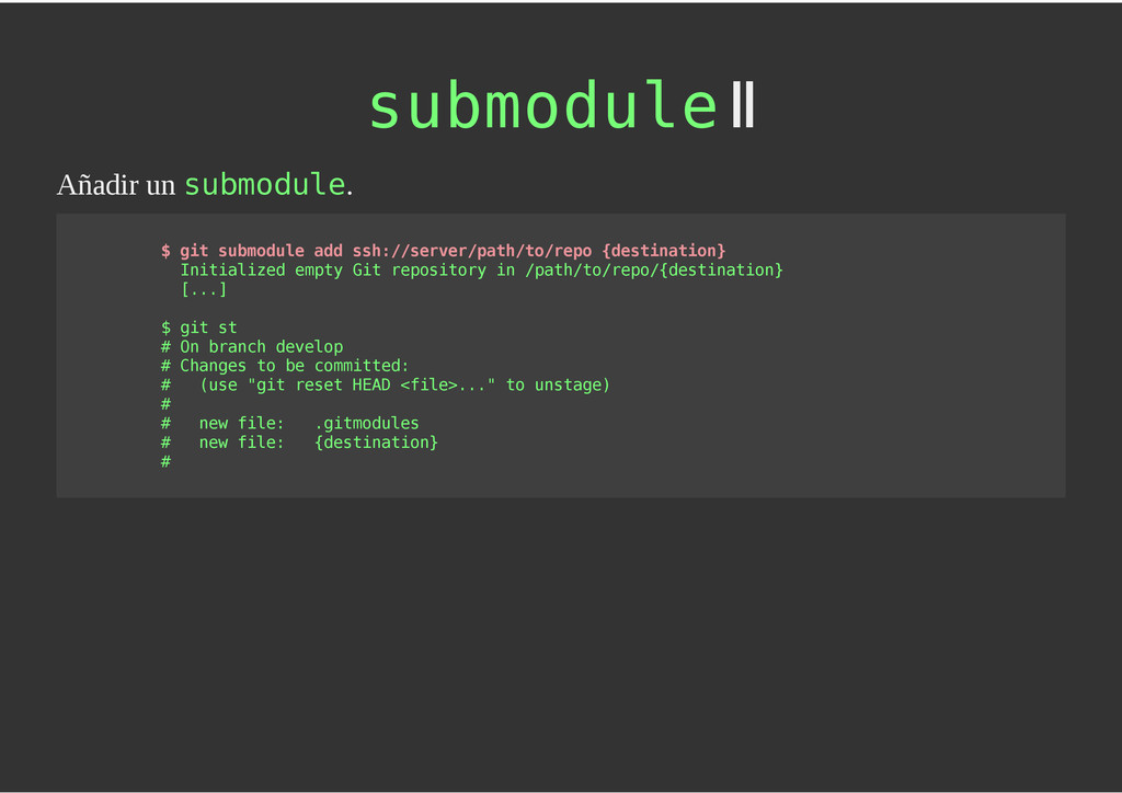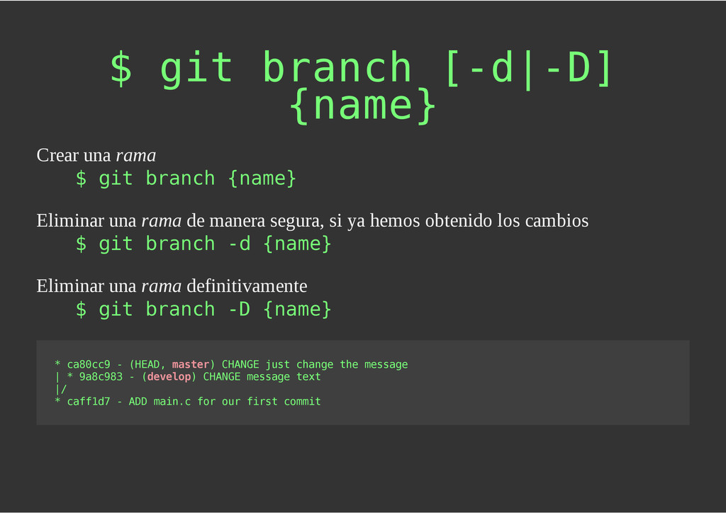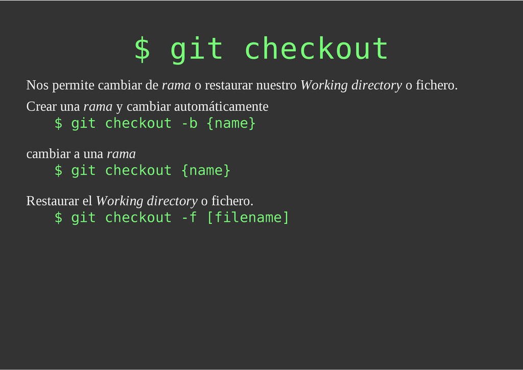 configuración personales, .gitconfig, .hgrc, .vimrc, etc. Diferentes ficheros, PSD, DOC, ODT... Sistemas de logs Clon de Github, http://gitlabhq.com/ Sistemas de tickets distribuidos https://github.com/jeffWelling/ticgit http://ditz.rubyforge.org/ Ficheros de configuración Diferentes perfiles Originales deploys en servicios de terceros: Heroku Github pages Blogs Octopress Jekyll Bases de datos distribuidas http://code.google.com/p/gimd/ https://github.com/bestpractical/prophet Herramientas tipo dropbox con hosting propio http://sparkleshare.org/ Wikis http://atonie.org/2008/02/gitwiki http://ikiwiki.info/ http://gitit.net/ MÚLTIPLES USOS