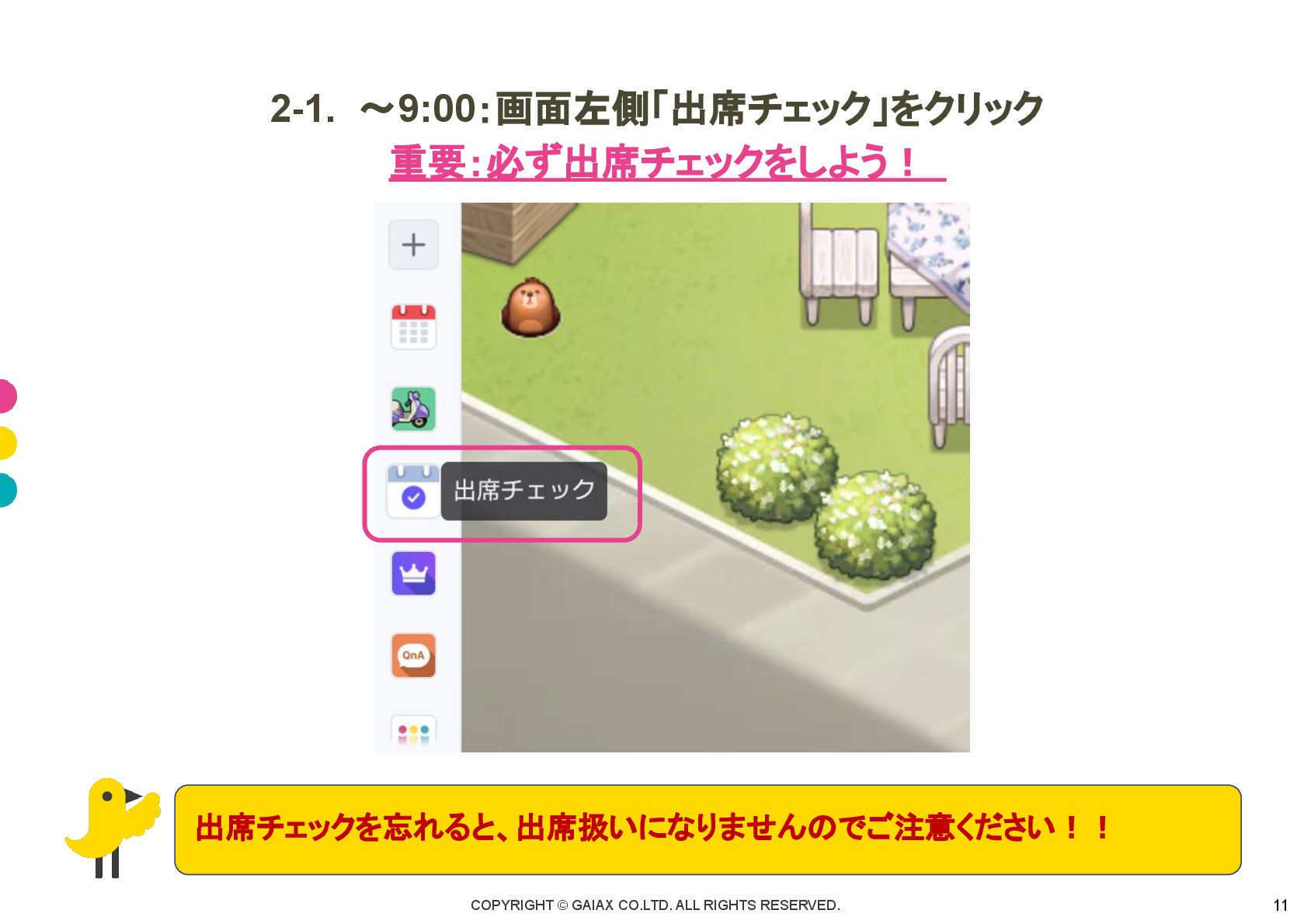 COPYRIGHT © GAIAX CO.LTD. ALL RIGHTS RESERVED. 11 2-1. 〜9:00:画面左側「出席チェック」をクリック