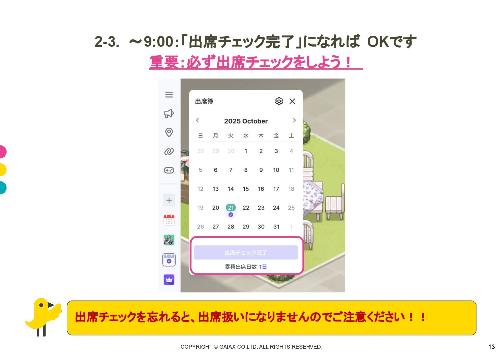 COPYRIGHT © GAIAX CO.LTD. ALL RIGHTS RESERVED. 13 2-3. 〜9:00:「出席チェック完了」になれば