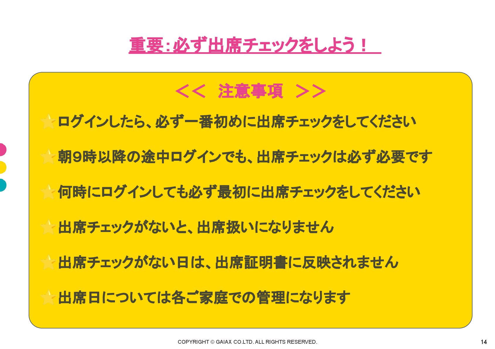 COPYRIGHT © GAIAX CO.LTD. ALL RIGHTS RESERVED. 14 重要:必ず出席チェックをしよう! << 注意事項 >>