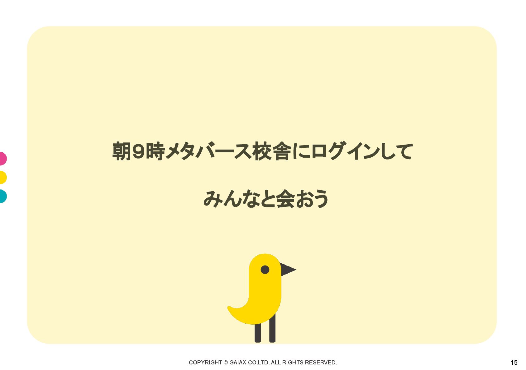 COPYRIGHT © GAIAX CO.LTD. ALL RIGHTS RESERVED. 15 15 朝9時メタバース校舎にログインして