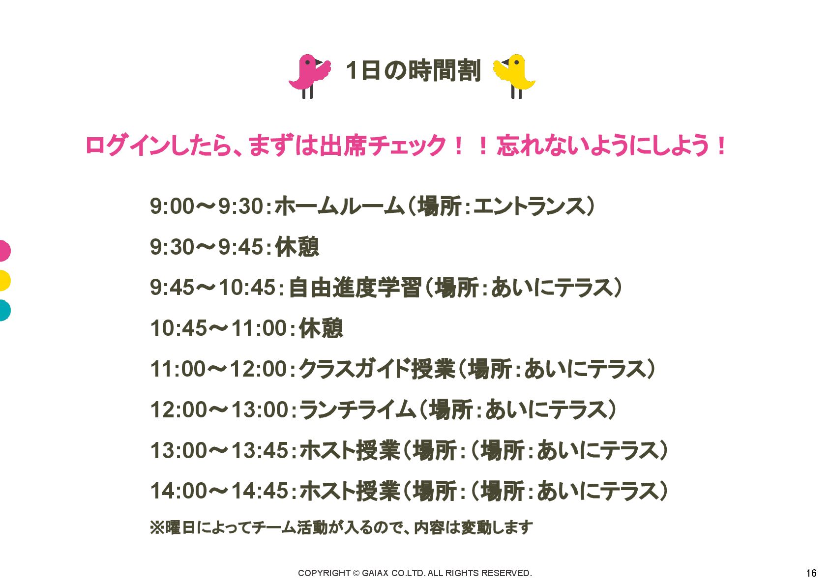 COPYRIGHT © GAIAX CO.LTD. ALL RIGHTS RESERVED. 1日の時間割 16 9:00〜9:30:ホームルーム(場所:エントランス)