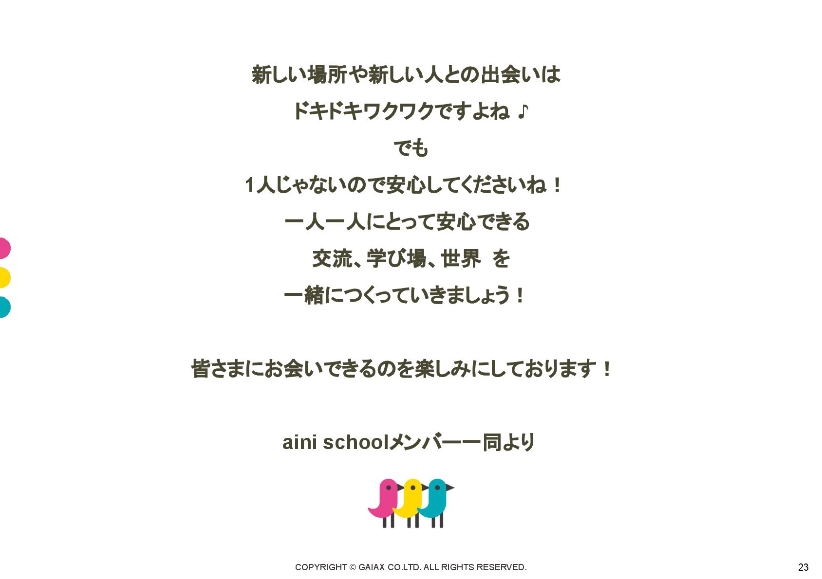 ♪ でも 1人じゃないので安心してくださいね! 一人一人にとって安心できる 交流、学び場、世界 を 一緒につくっていきましょう! 皆さまにお会いできるのを楽しみにしております! aini schoolメンバー一同より