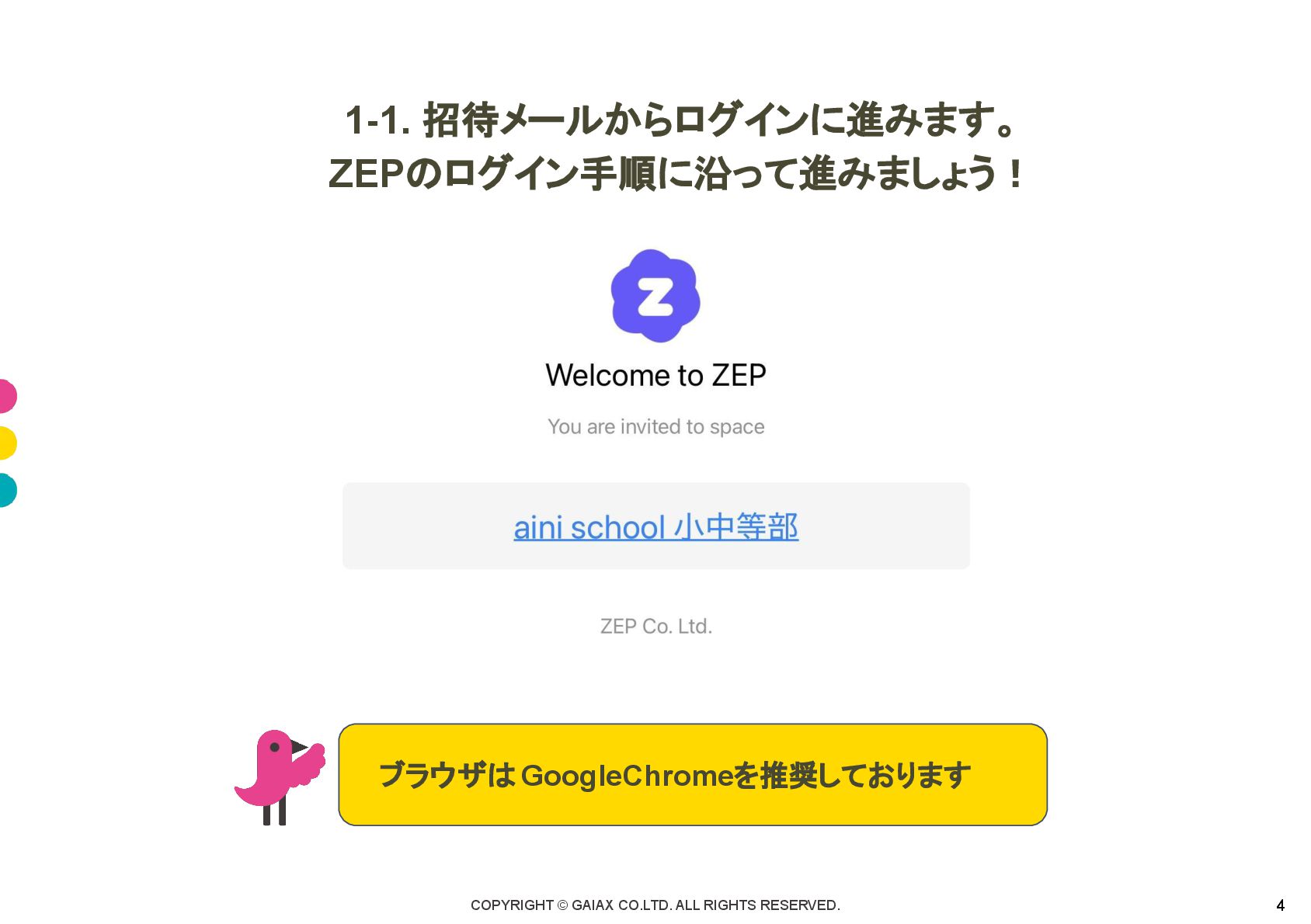 招待メールからログインに進みます。 ZEPのログイン手順に沿って進みましょう! ブラウザは GoogleChromeを推奨しております