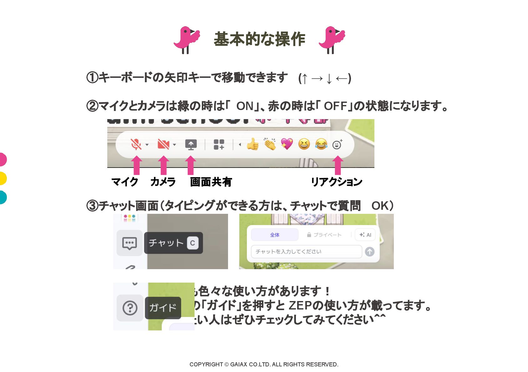 ↓ ←) ②マイクとカメラは緑の時は「 ON」、赤の時は「 OFF」の状態になります。 ③チャット画面(タイピングができる方は、チャットで質問 OK) 他にも色々な使い方があります! 左側の「ガイド」を押すと ZEPの使い方が載ってます。 知りたい人はぜひチェックしてみてください^^ 前 基本的な操作 マイク カメラ 画面共有 リアクション