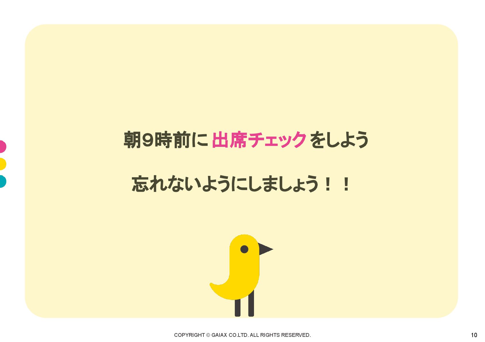 COPYRIGHT © GAIAX CO.LTD. ALL RIGHTS RESERVED. 10 朝9時前に 出席チェック