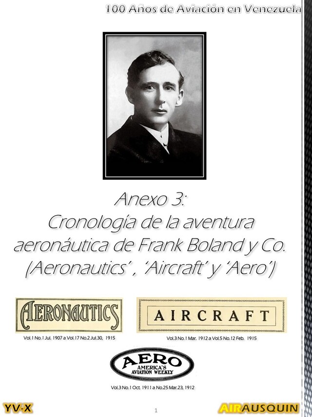Boland, el 23 de Enero de 1913 en Puerto España, Trinidad. Se reporta que en un vuelo preliminar, la maquina se vino ‘en picada repentinamente’. Se destaca que la novedosa maquina era conocida por los lectores de ‘Aeronautics’ por tener un aparato de balanceo (alabeo) único diseñado para evitar conflictos con la patente de los Wright. Se destaca también que Boland era un aviador temerario pero al mismo tiempo cauteloso, que se enseño a volar a si mismo en 1908, cuando comenzó a experimentar con este tipo de maquina, no teniendo nunca un accidente serio, usando el mismo tipo de motor durante 3 años , haciendo vuelos casi a diario. Es de hacer notar que esta publicación salía al fin del mes. ‘Aeronautics’ Feb .1913 p70 Descripción de la imagen de portada de la edición de Febrero de 1913 en homenaje al fallecido Frank E. Boland, mostrando al ‘Sin- cola’ con el cual estuvo volando y experimentando por un periodo de 5 años. Es la misma foto tomada en 1910 usada para promocionar los vuelos en Venezuela en 1912. ‘Aeronautics’ Mar.1913 p100 Descripción del nuevo ‘Sin-cola’ de 1912 de Boland con el cual efectuó los vuelos de exhibición en Caracas, Valencia, Puerto Cabello, Maracaibo (dejando fuera Barquisimeto, que no era parte del programa original) y ‘otros pueblos de Suramérica’. La reseña va acompañada de una foto (incluida en el anexo 2 de esta investigación) que muestra el avión usado en Venezuela, distinguible por la forma muy curva del soporte inferior del canard (es mas recta en los dibujos de 3 vistas). Como sus predecesores, es sin cola, sin timón de dirección, y sin ‘wing- warping’. Los giros y el balanceo son logrados por unos ‘jibs’ creadores de resistencia no interconectados en los extremos de las alas que actúan uno a la vez. Todo el peso es colocado en el ‘bote’ (carenado) y la mayoría del braceado es desde la parte inferior del bote cerca del centro. El asiento del pasajero está colocado en el centro de sustentación. El motor, como el avión, es construido por la Boland Aeroplane and Motor Co de N.J. ‘Aircraft’ Mar. 1913 p60 Notificación del fallecimiento de Frank Boland, el ‘24’ de Enero de 1913 en Puerto España, Trinidad. Se reporta que la razón fue probablemente por bloqueo o rotura del ‘canard’, causando el desplome en picada de la aeronave. A diferencia de ‘Aeronautics’, en ‘Aircraft’ se dice que aunque la muerte de Boland fue un shock para muchos, no era una sorpresa para aquellos que habían visto el avión, ya que este a pesar de ser bueno en principio, era ‘tan pobre en construcción que era solo cuestión de tiempo antes de que una parte vital cediera, lo cual parece haber sucedido en este caso en particular.’ (Parecen opinar del sin-cola de 1910).