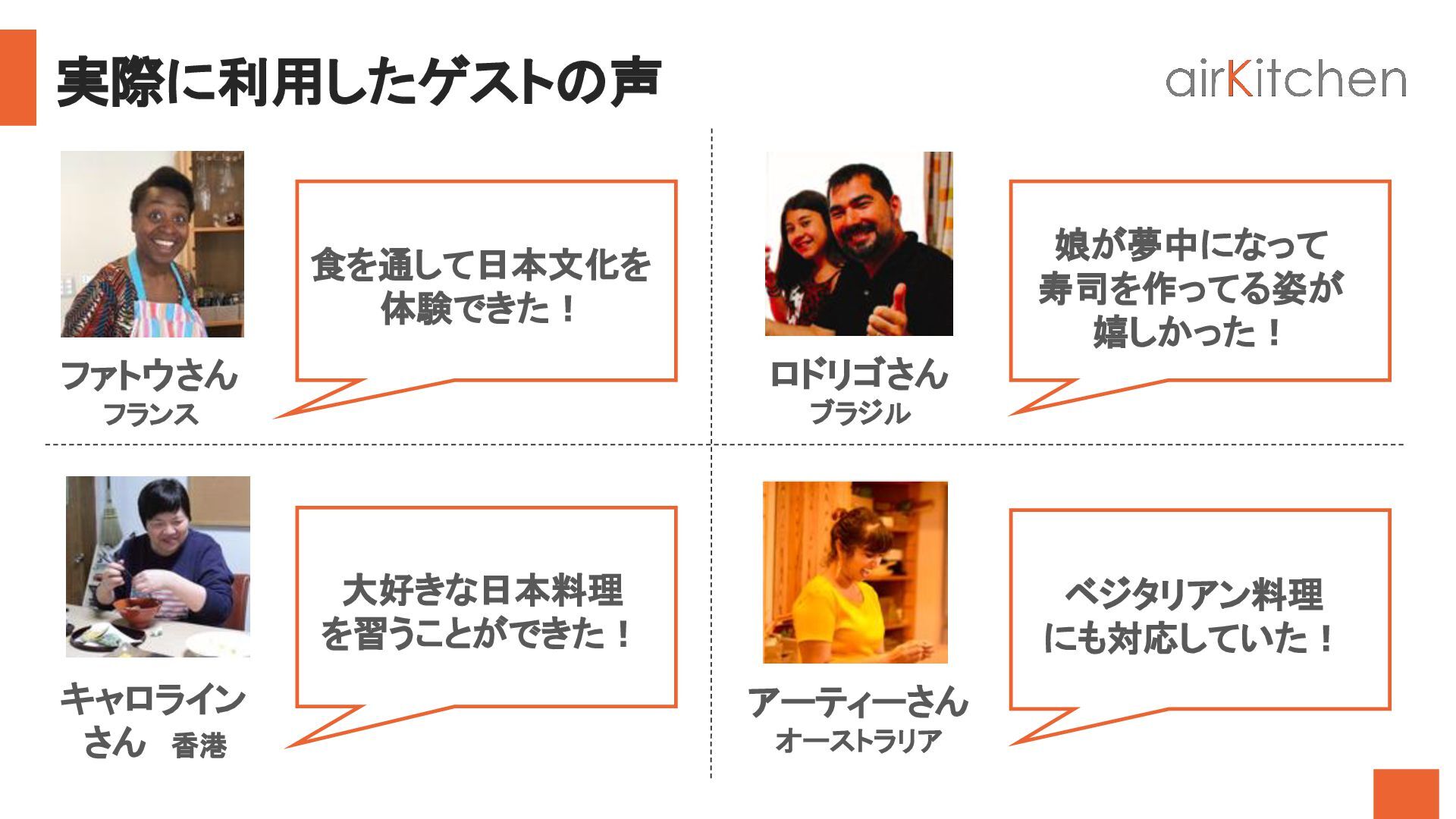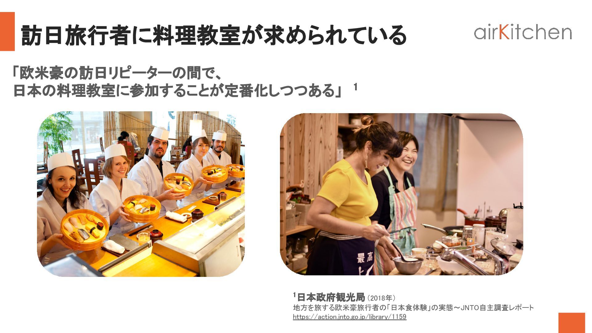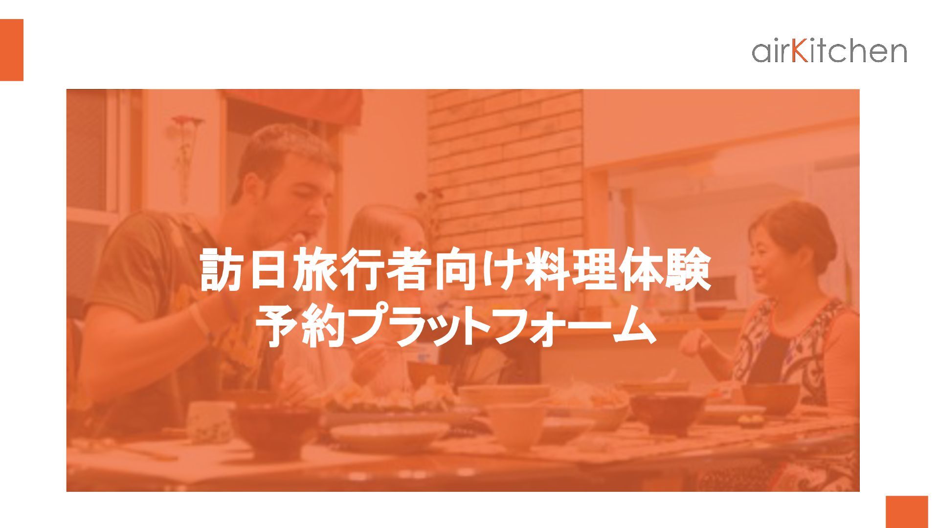 travelers from all around the world to book an authentic cooking class by Japanese hosts in their homes. Learn to cook homemade Japanese food and enjoy the warmth of eating around a dinner table with Japanese locals. airKitchen 旅行会社向け概要資料