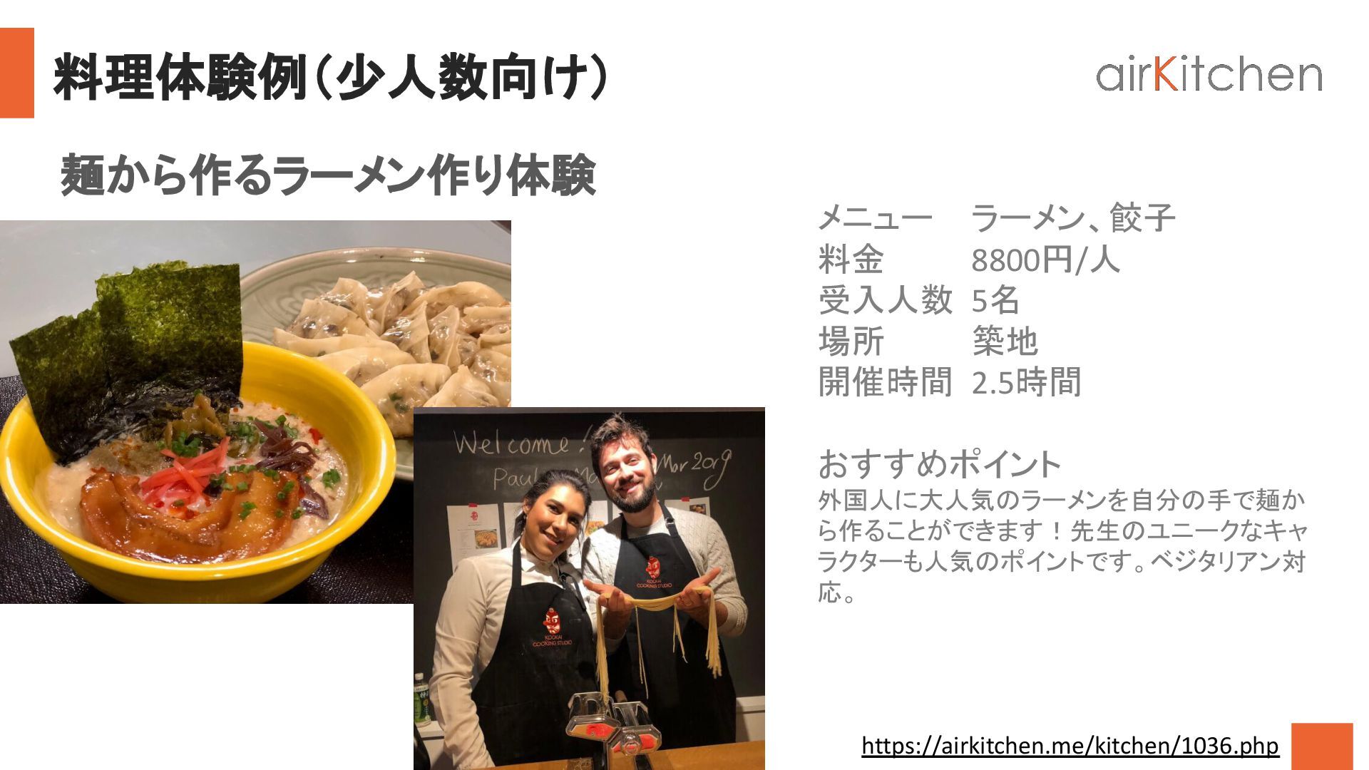 2.5時間 おすすめポイント 外国人に大人気のラーメンを自分の手で麺か ら作ることができます!先生のユニークなキャ ラクターも人気のポイントです。ベジタリアン対 応。 麺から作るラーメン作り体験 https://airkitchen.me/kitchen/1036.php