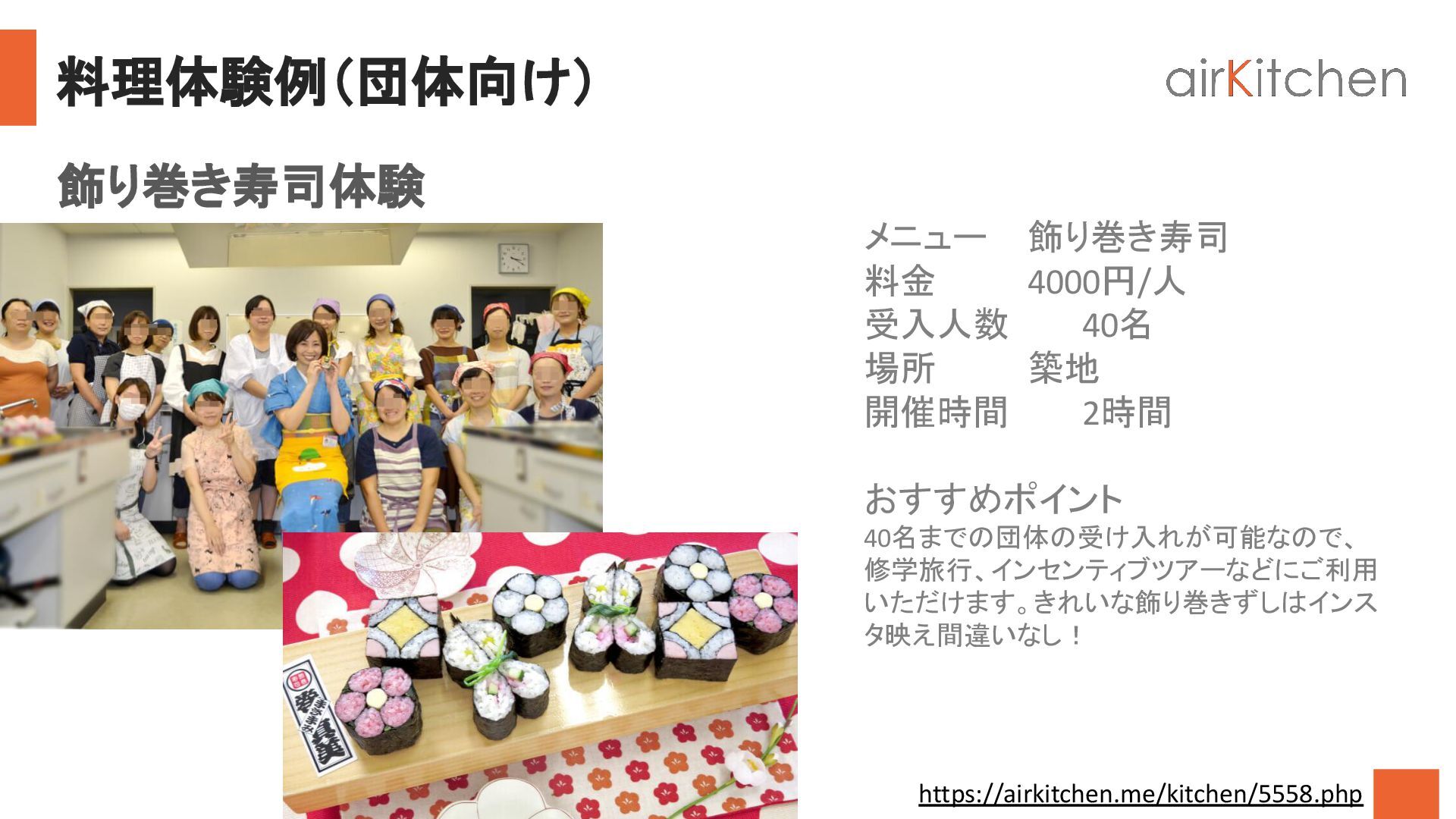 5. 料理体験例(団体向け) https://airkitchen.me/kitchen/5558.php 飾り巻き寿司体験 メニュー 飾り巻き寿司 料金    4000円/人 受入人数  40名 場所
