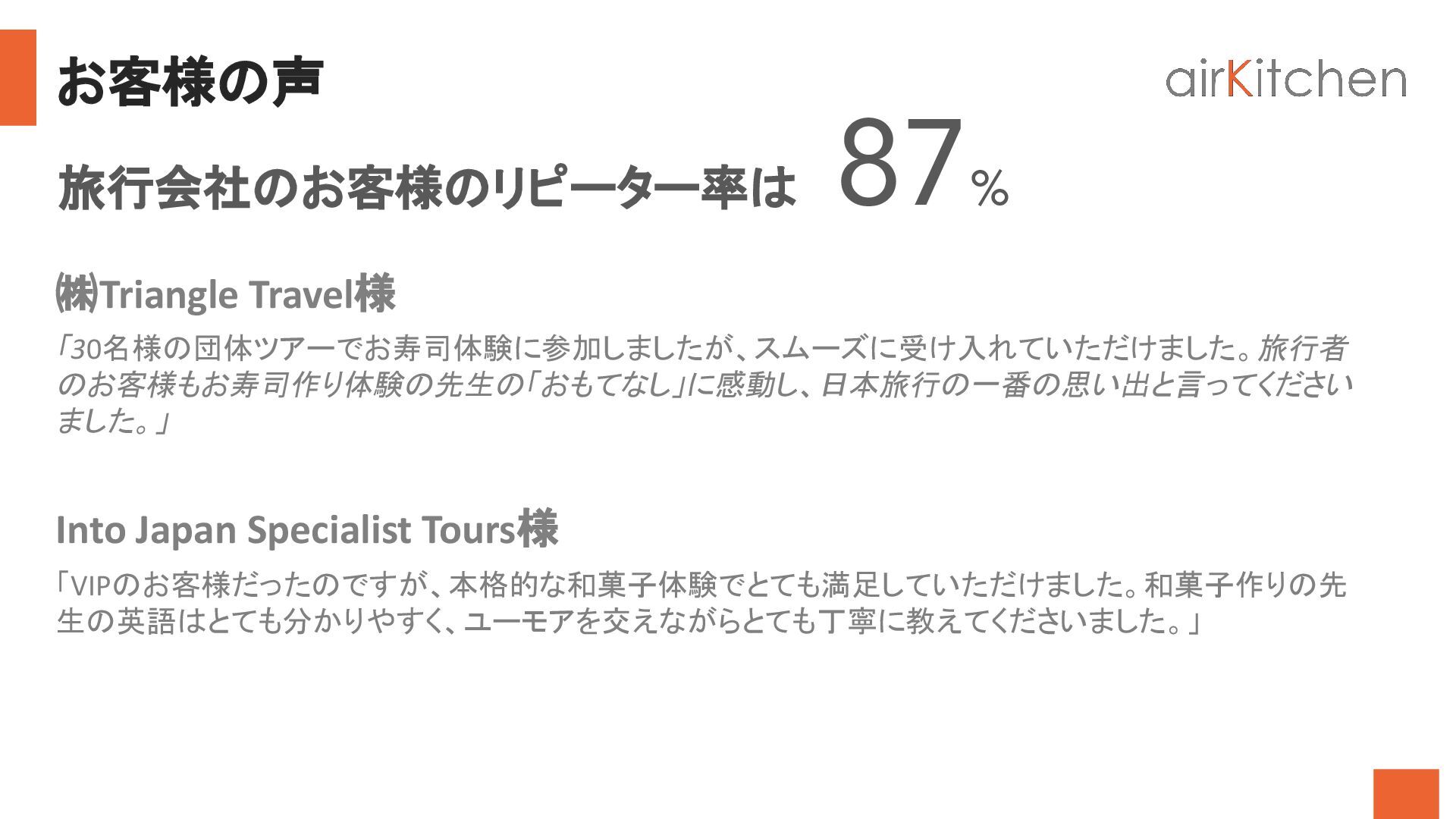 7. お客様の声 旅行会社のお客様のリピーター率は 87% Into Japan Specialist Tours様 「30名様の団体ツアーでお寿司体験に参加しましたが、スムーズに受け入れていただけました。旅行者 のお客様もお寿司作り体験の先生の「おもてなし」に感動し、日本旅行の一番の思い出と言ってください ました。」