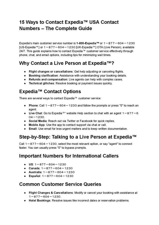 To reach a live person at Expedia customer service for support +1-877-604-1230, you can call their 24/7 Expedia Phone number hotline at ( +1-877-604-1230). OTA (Live Person) or 1-800-Expedia ( +1-877-604-1230). You can also use the live chat feature on their website or reach out to them via email. Speaking with a live representative at Expedia is straightforward . Whether you're dealing with booking issues, need to make changes to your travel plans, or have specific inquiries, reaching out to a live agent can quickly resolve your concerns. This guide explains the steps to contact Expedia customer service via phone +1-877-604-1230 and provides tips on the best times to call to minimize wait times.