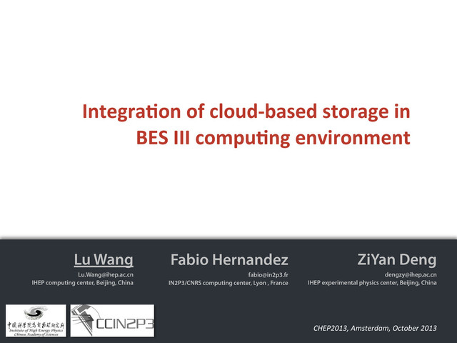 Beijing, China Fabio Hernandez [email protected] IN2P3/CNRS computing center, Lyon , France ZiYan Deng [email protected] IHEP experimental physics center, Beijing, China Integra(on of cloud-‐based storage in BES III compu(ng environment
