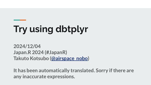 Science (dplyr) was introduced. ❏ The process used in SQL is simple and convenient, so dplyr may become popular in the dbt world. ❏ I will write a bit more about it in dbt Advent Calendar 2024 including the dbt installation process!