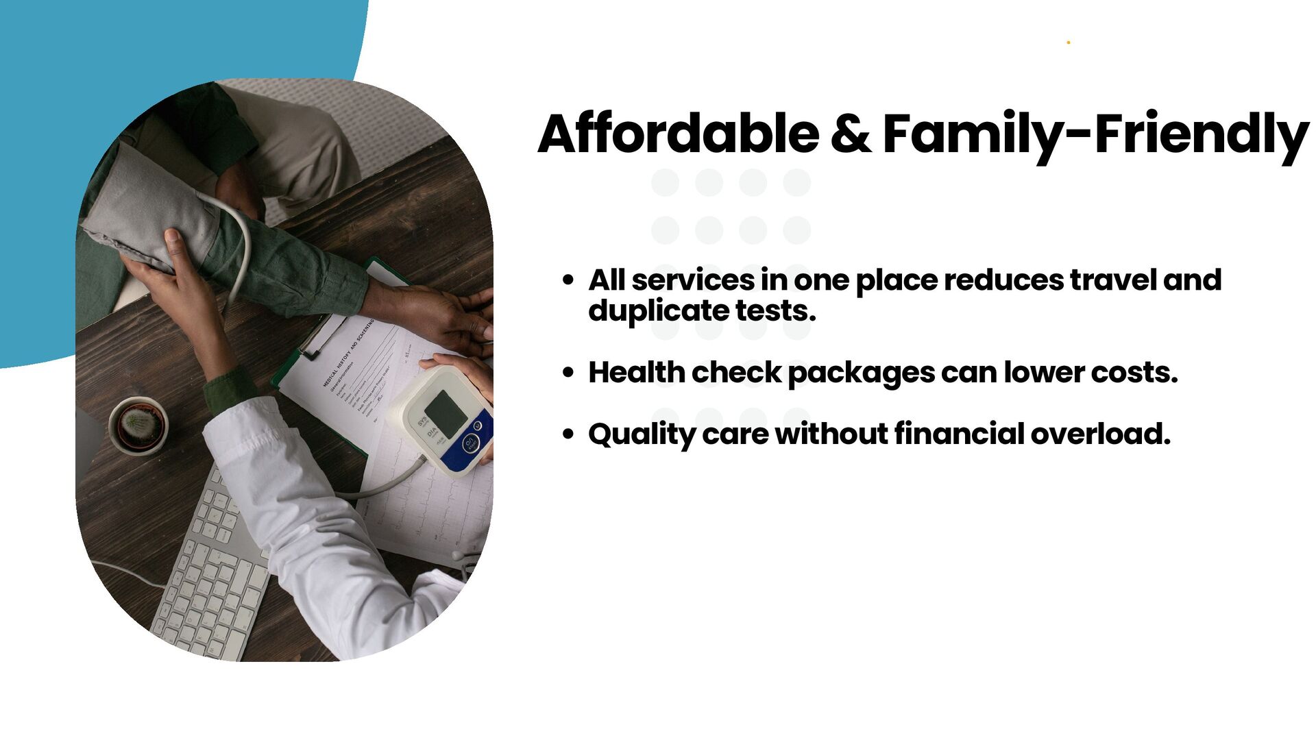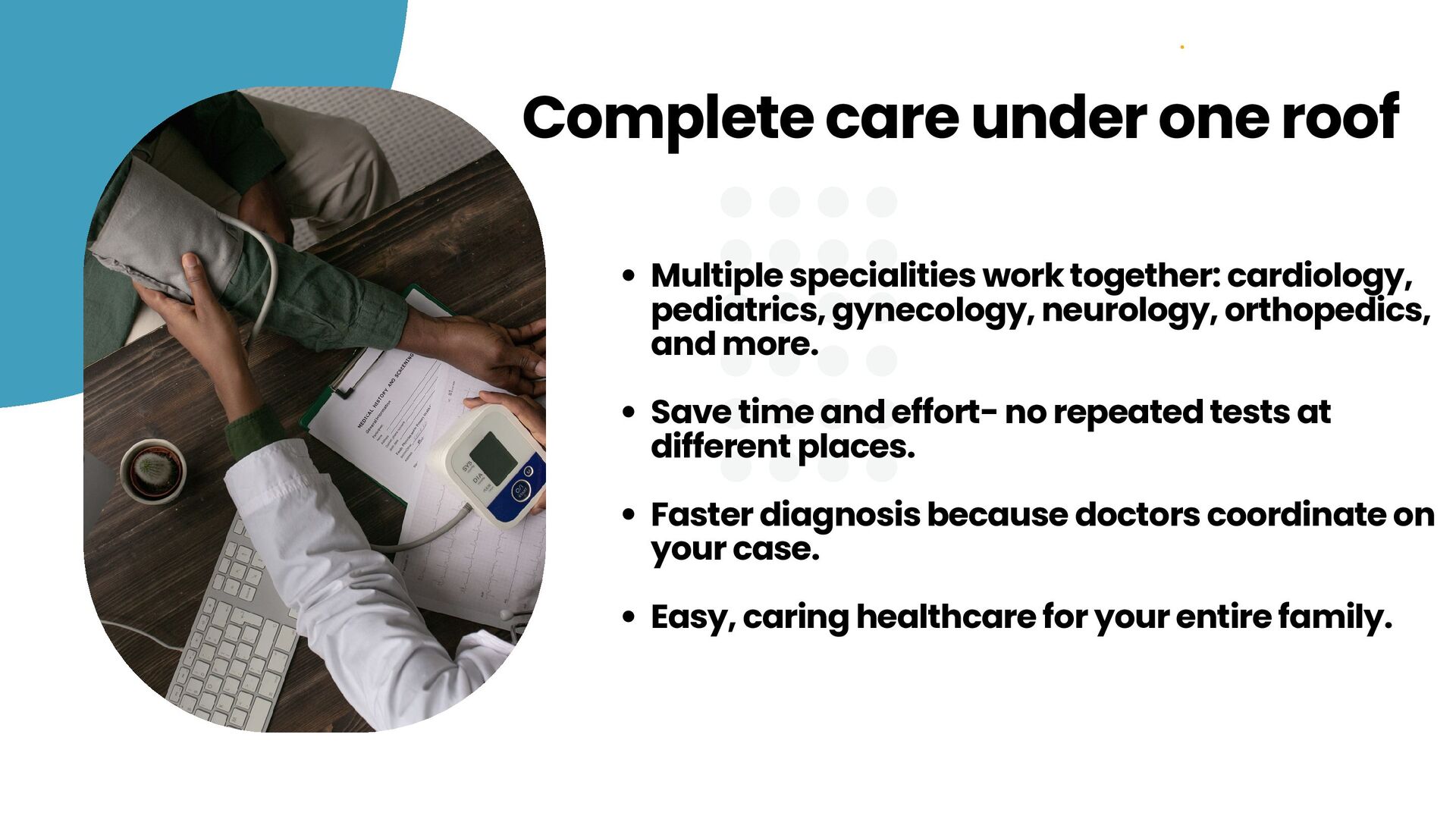 more. Save time and effort- no repeated tests at different places. Faster diagnosis because doctors coordinate on your case. Easy, caring healthcare for your entire family. Complete care under one roof
