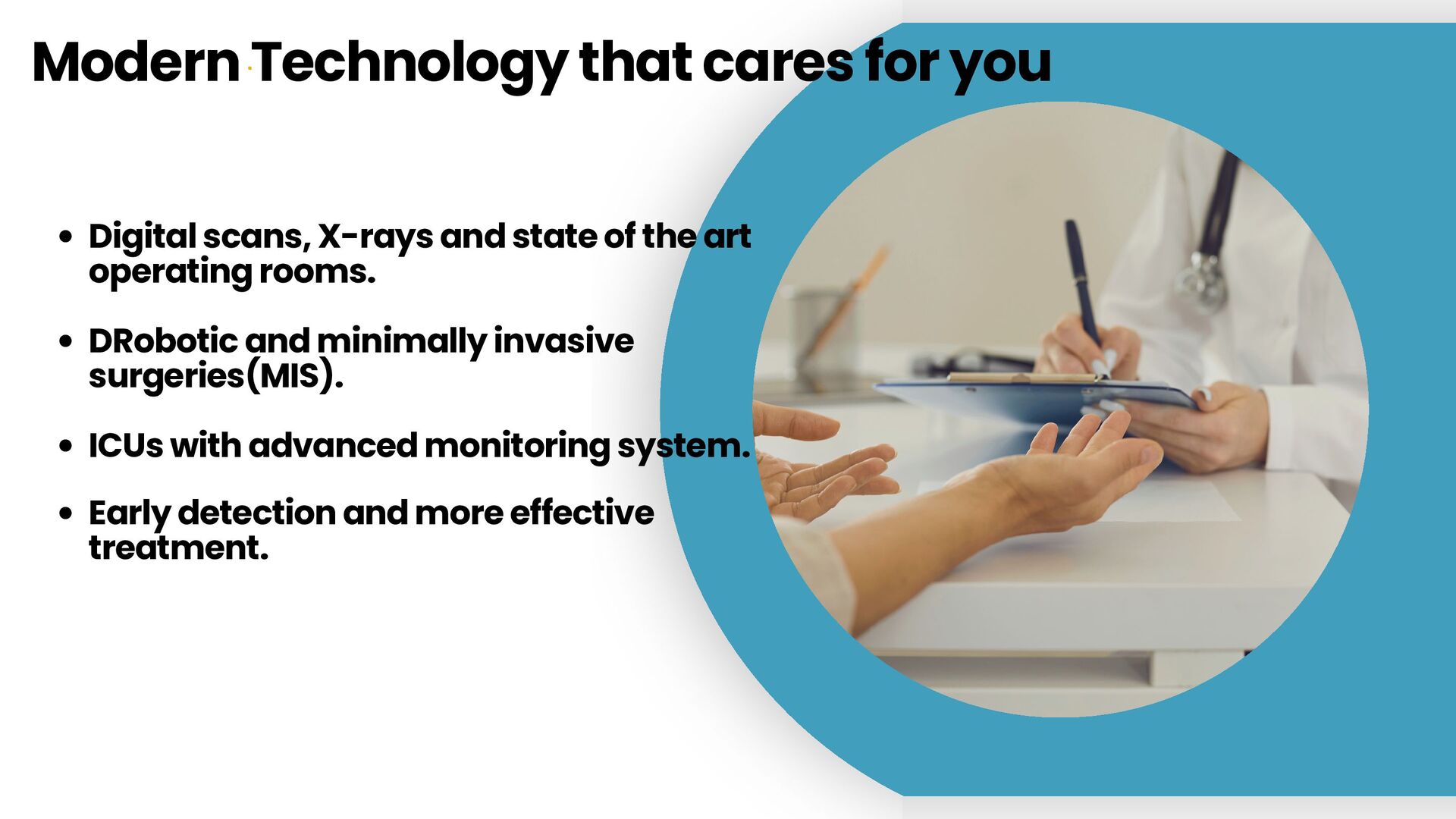 state of the art operating rooms. DRobotic and minimally invasive surgeries(MIS). ICUs with advanced monitoring system. Early detection and more effective treatment.