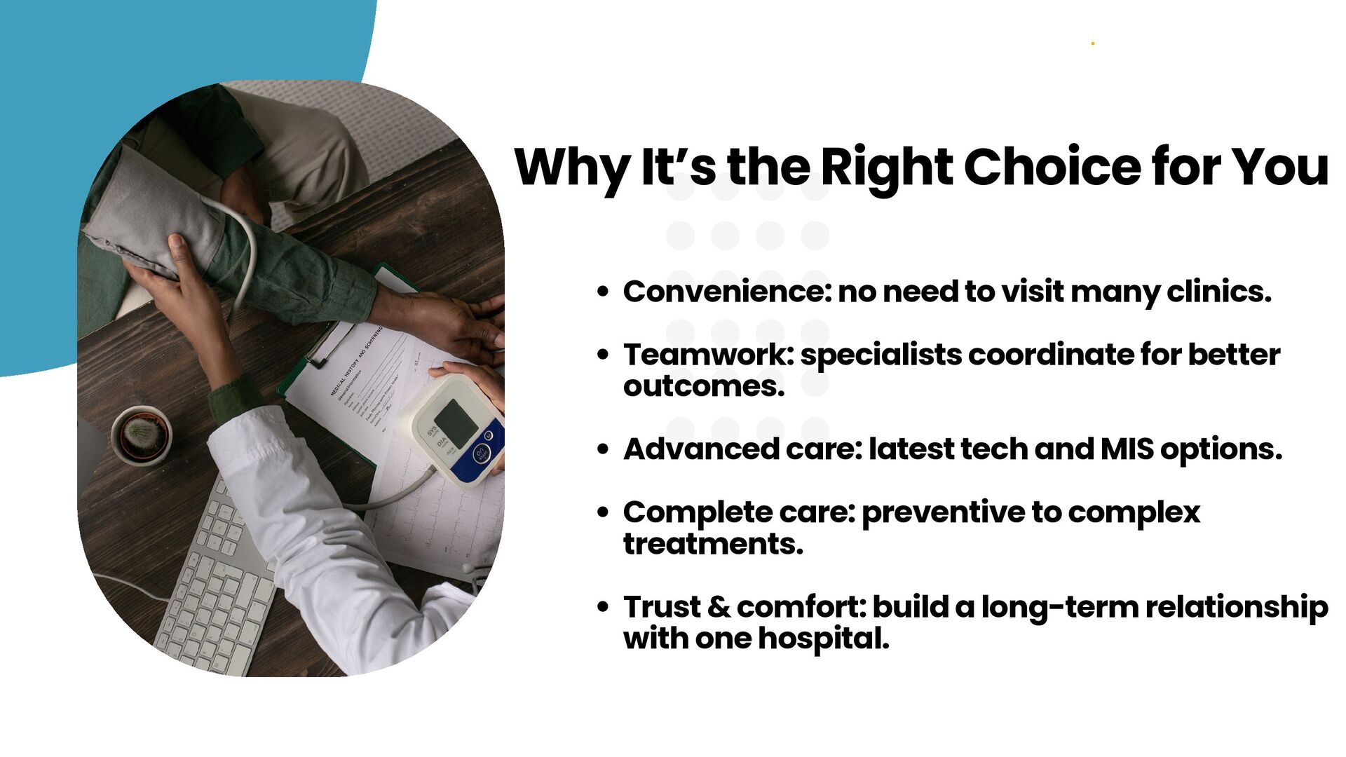 for better outcomes. Advanced care: latest tech and MIS options. Complete care: preventive to complex treatments. Trust & comfort: build a long-term relationship with one hospital. Why It’s the Right Choice for You