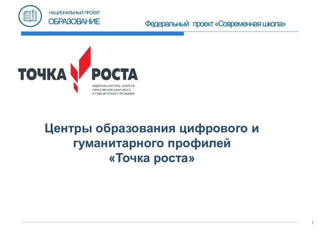 ОБРАЗОВАНИЕ Центры образования цифрового и гуманитарного профилей «Точка роста» создаются как структурные подразделения общеобразовательных организаций, осуществляющих образовательную деятельность по ОП НОО, ООО и (или) СОО, расположенных в сельской местности и малых городах и направлены на формирование современных компетенций и навыков у обучающихся, в том числе по учебным предметам «Технология», «Информатика», «Основы безопасности жизнедеятельности» Центр может выполнять функцию общественного пространства для развития общекультурных компетенций, цифровой грамотности, шахматного образования, проектной деятельности, творческой, социальной самореализации детей, педагогов, родительской общественности.