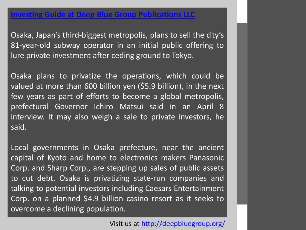 third-biggest metropolis, plans to sell the city’s 81-year-old subway operator in an initial public offering to lure private investment after ceding ground to Tokyo. Osaka plans to privatize the operations, which could be valued at more than 600 billion yen ($5.9 billion), in the next few years as part of efforts to become a global metropolis, prefectural Governor Ichiro Matsui said in an April 8 interview. It may also weigh a sale to private investors, he said. Local governments in Osaka prefecture, near the ancient capital of Kyoto and home to electronics makers Panasonic Corp. and Sharp Corp., are stepping up sales of public assets to cut debt. Osaka is privatizing state-run companies and talking to potential investors including Caesars Entertainment Corp. on a planned $4.9 billion casino resort as it seeks to overcome a declining population. Visit us at http://deepbluegroup.org/