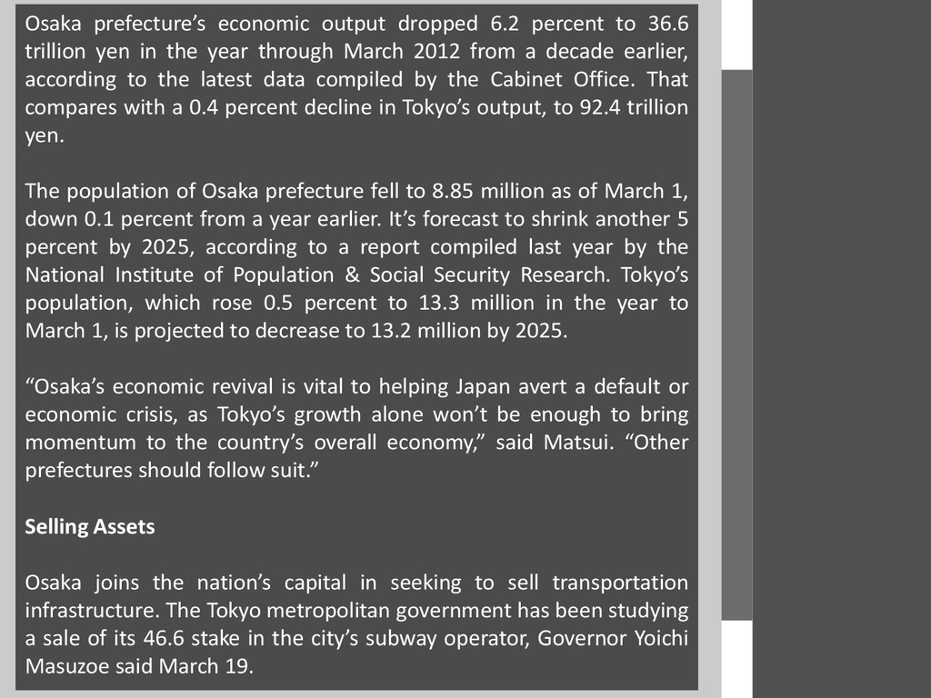yen in the year through March 2012 from a decade earlier, according to the latest data compiled by the Cabinet Office. That compares with a 0.4 percent decline in Tokyo’s output, to 92.4 trillion yen. The population of Osaka prefecture fell to 8.85 million as of March 1, down 0.1 percent from a year earlier. It’s forecast to shrink another 5 percent by 2025, according to a report compiled last year by the National Institute of Population & Social Security Research. Tokyo’s population, which rose 0.5 percent to 13.3 million in the year to March 1, is projected to decrease to 13.2 million by 2025. “Osaka’s economic revival is vital to helping Japan avert a default or economic crisis, as Tokyo’s growth alone won’t be enough to bring momentum to the country’s overall economy,” said Matsui. “Other prefectures should follow suit.” Selling Assets Osaka joins the nation’s capital in seeking to sell transportation infrastructure. The Tokyo metropolitan government has been studying a sale of its 46.6 stake in the city’s subway operator, Governor Yoichi Masuzoe said March 19.