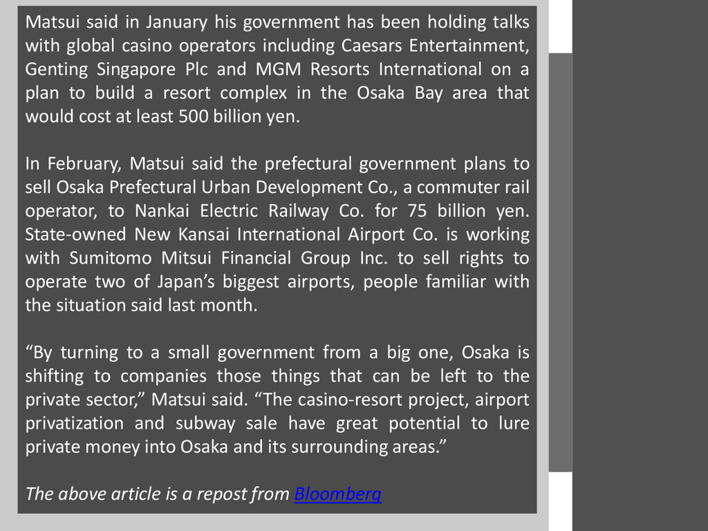 with global casino operators including Caesars Entertainment, Genting Singapore Plc and MGM Resorts International on a plan to build a resort complex in the Osaka Bay area that would cost at least 500 billion yen. In February, Matsui said the prefectural government plans to sell Osaka Prefectural Urban Development Co., a commuter rail operator, to Nankai Electric Railway Co. for 75 billion yen. State-owned New Kansai International Airport Co. is working with Sumitomo Mitsui Financial Group Inc. to sell rights to operate two of Japan’s biggest airports, people familiar with the situation said last month. “By turning to a small government from a big one, Osaka is shifting to companies those things that can be left to the private sector,” Matsui said. “The casino-resort project, airport privatization and subway sale have great potential to lure private money into Osaka and its surrounding areas.” The above article is a repost from Bloomberg